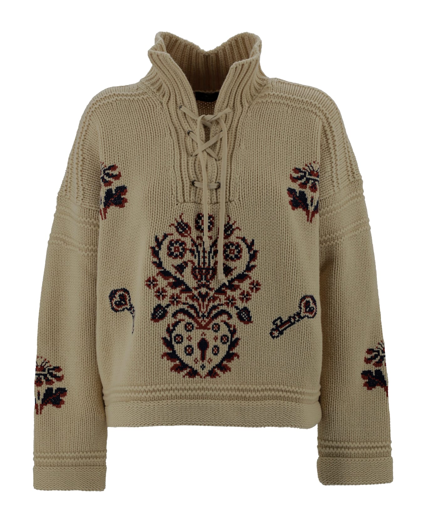 With a boho chic style and artisanal details, the sweater is made of warm and soft wool and features an elegant high collar with braided closures and floral folk embroideries that give an ethnic and refined touch. The central heart motif embroidered on the front and floral details express a romantic style.