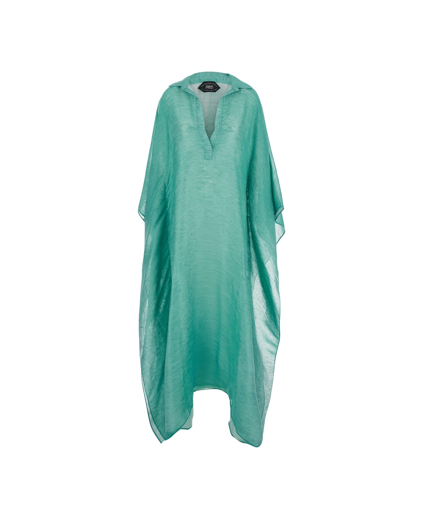 Caftan Light blue French collar Cut-off front Long sleeves Asymmetric hem Floor length Linen and viscose blend Loose fit