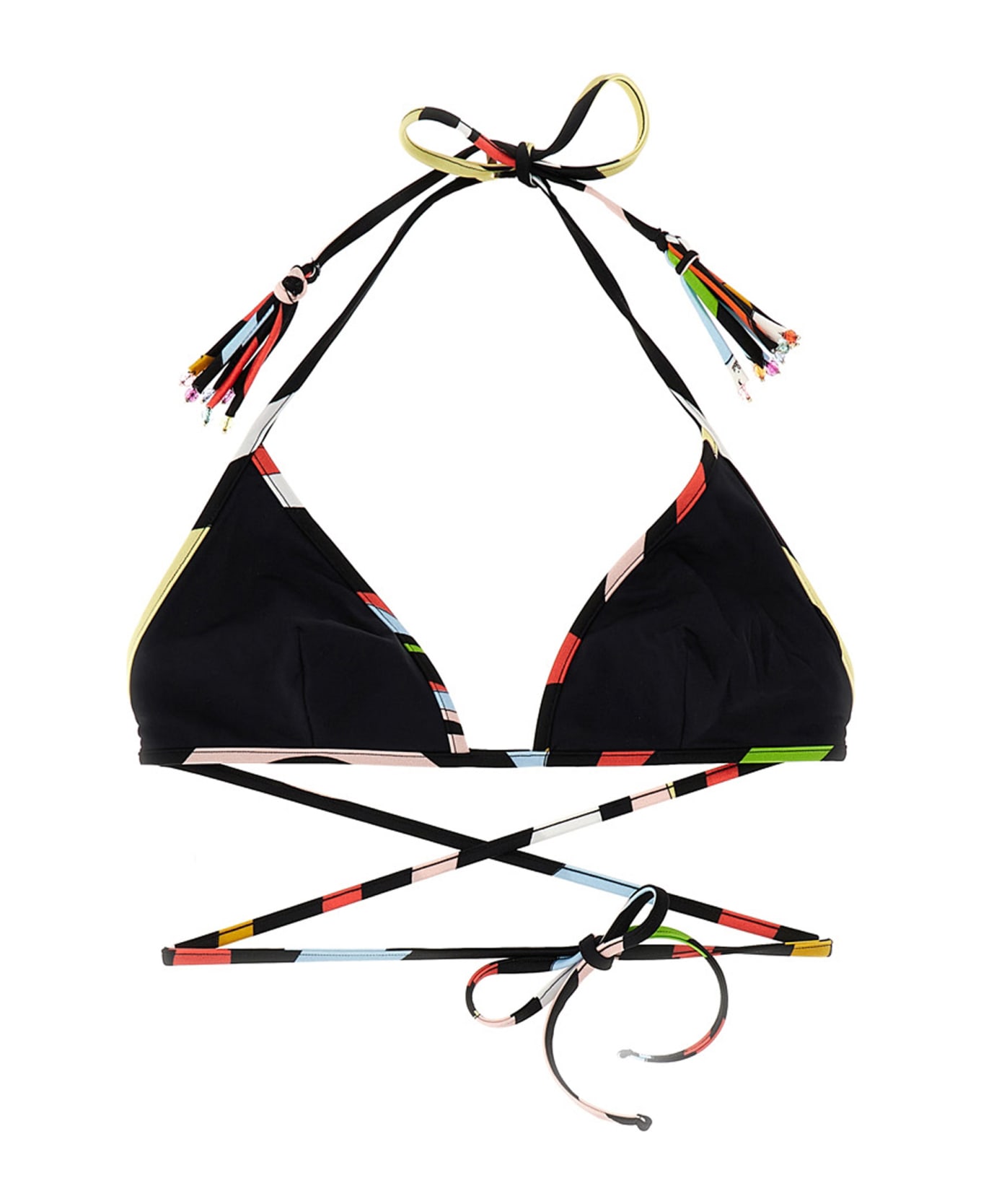 Stretch fabric bikini top with print on the edging and a lacing. Composition: 90% viscose 6% polyamide 4% elastane