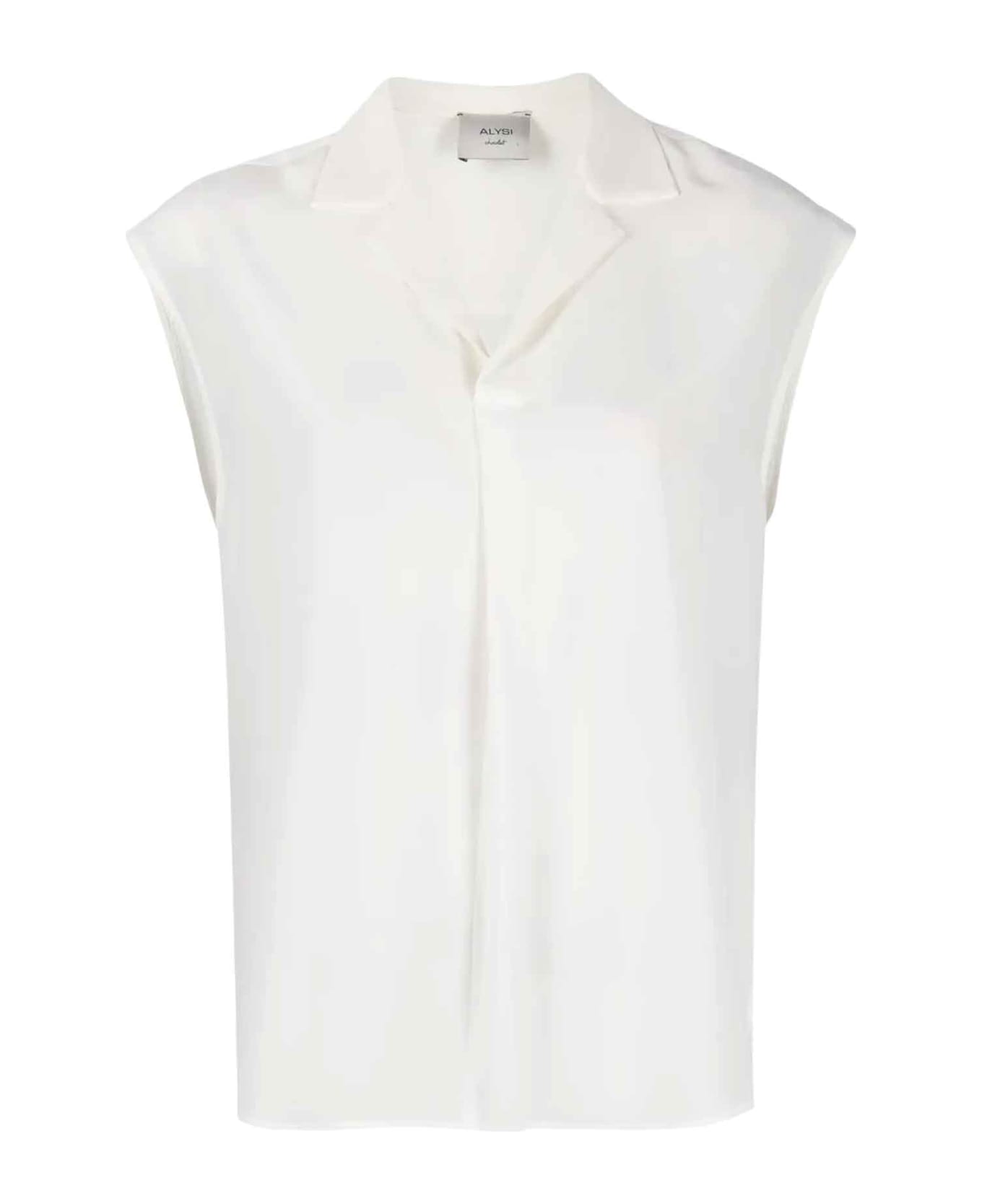 White blouse women. Gather detail, lapel collar, sleeveless, and straight hem. 100% silk