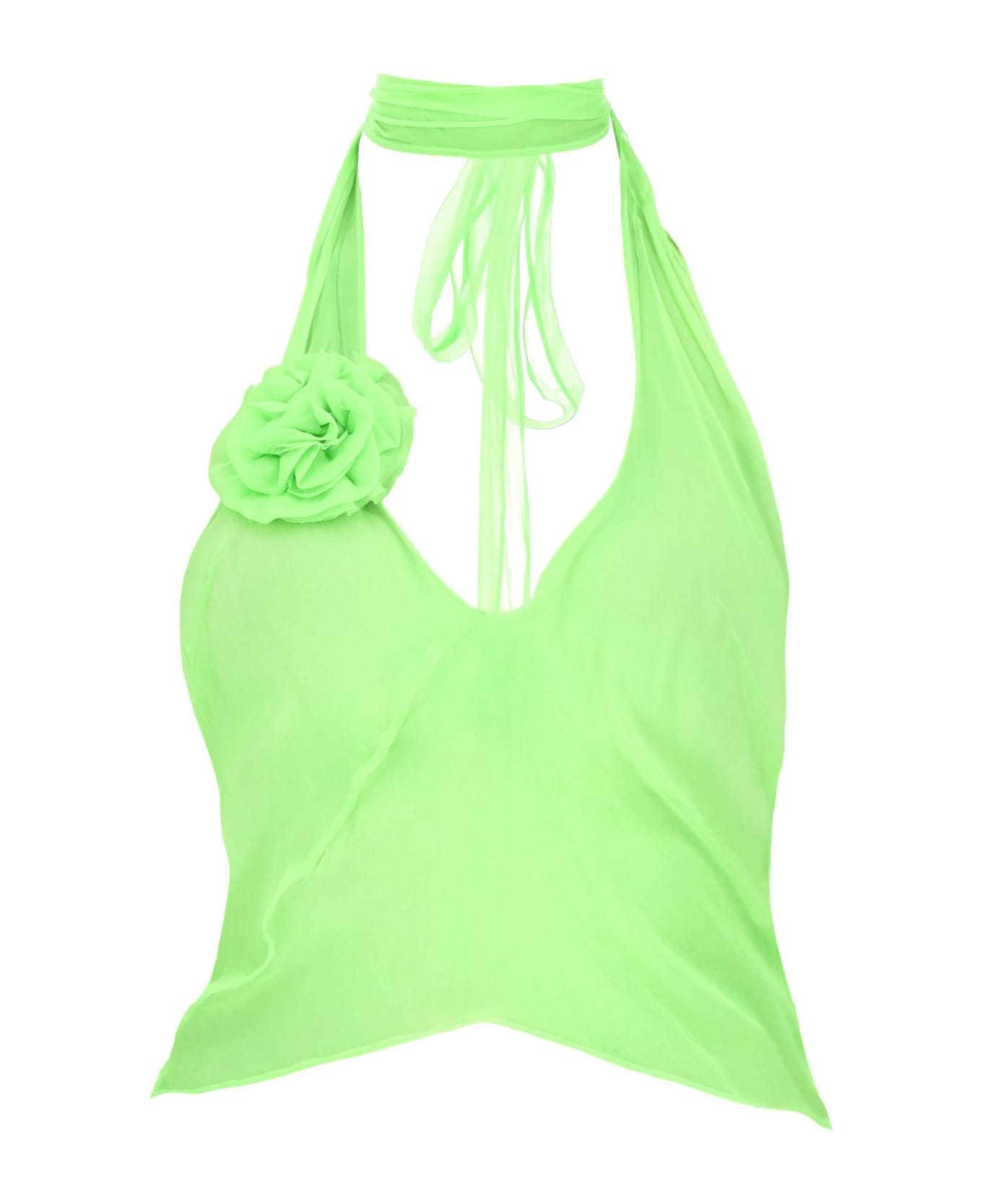 Saks Potts top in sheer silk organza, featuring a halter neckline with long straps to tie at neck. Enriched by a matching 3D floral detachable detail and finished with side invisible zip fastening. Loose fit. The model is 177 cm tall and wears a size XS.