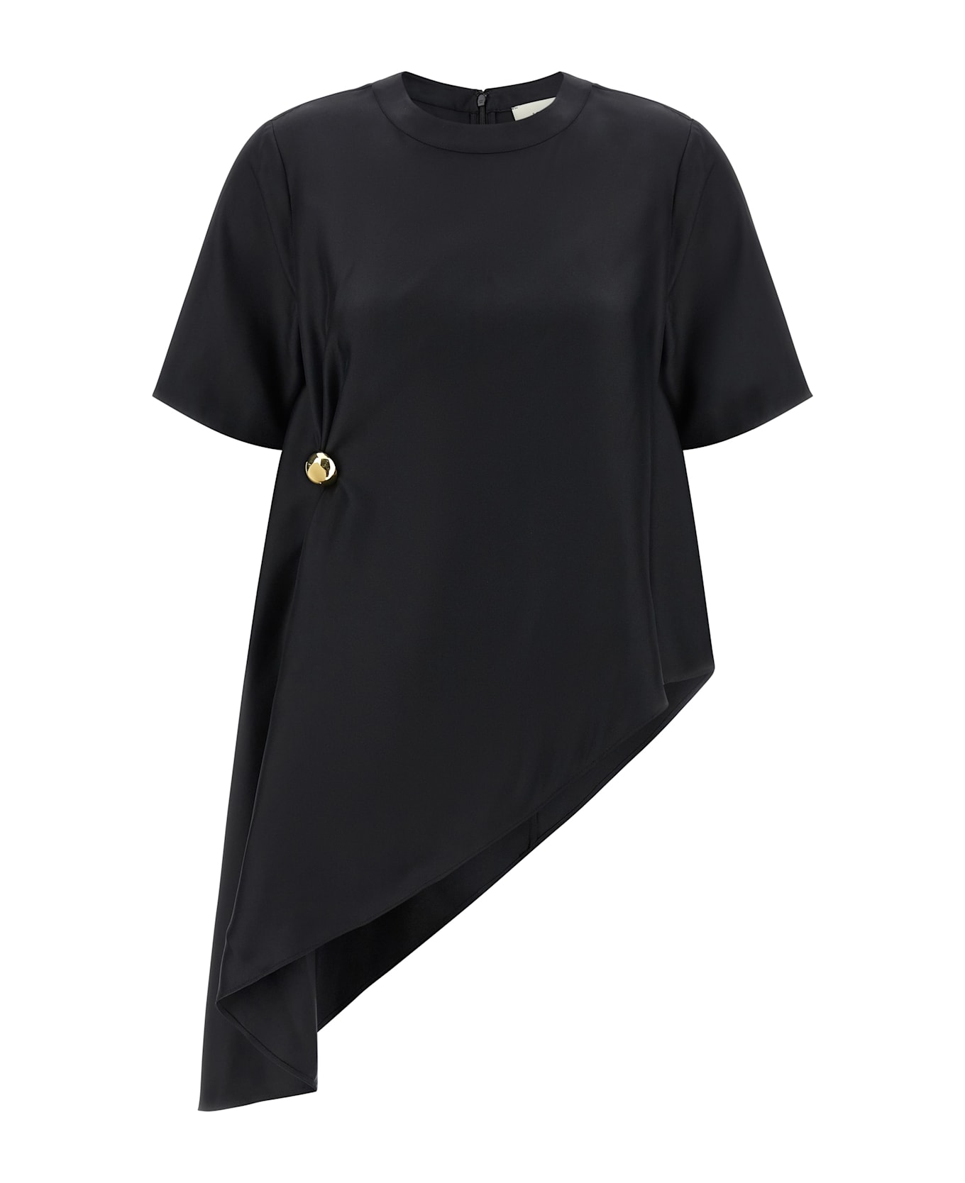 'Madea' silk twill top with trapezoid silhouette, side draping thanks to metal detail, crew neck, back zip closure, short sleeves, asymmetrical hem.