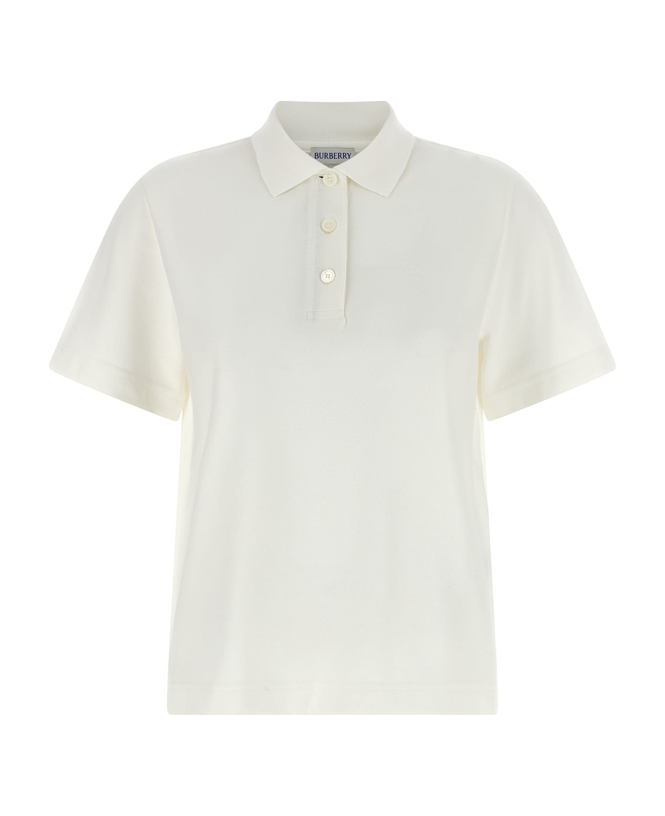 'Priscilla' cotton piqué polo shirt, tone-on-tone 'Equestrian Knight Design' embroidery on the front, collar and buttons with knitted Burberry Check placket, short sleeves, side slits. Composition: 100% cotton