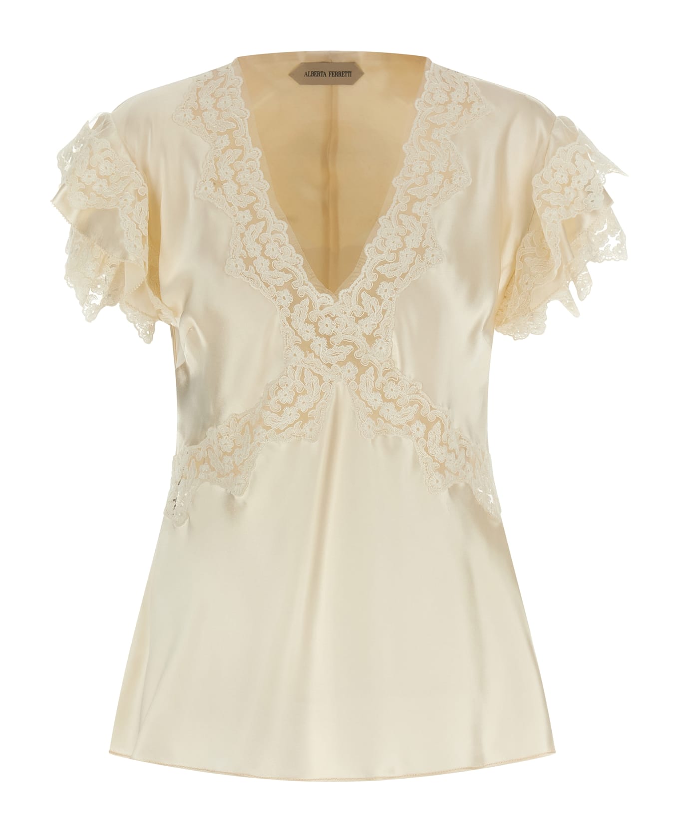 Satin top with tone-on-tone lace inserts, hourglass silhouette, V-neck, and short, multi-layered sleeves with ruffles.