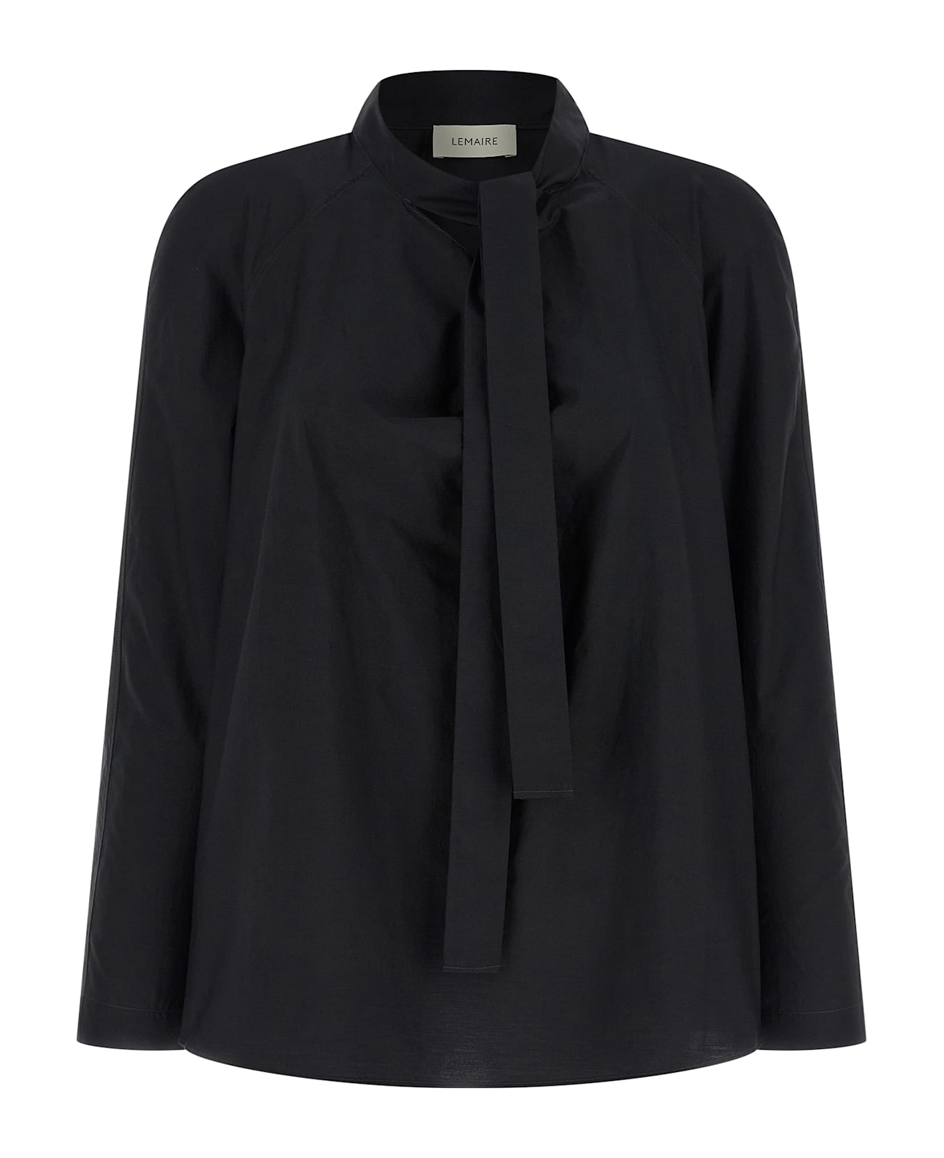 'Ascot' blouse in light cotton and silk blend, round neckline with scarf knotted around the neck, long raglan sleeves with contrast stitching.