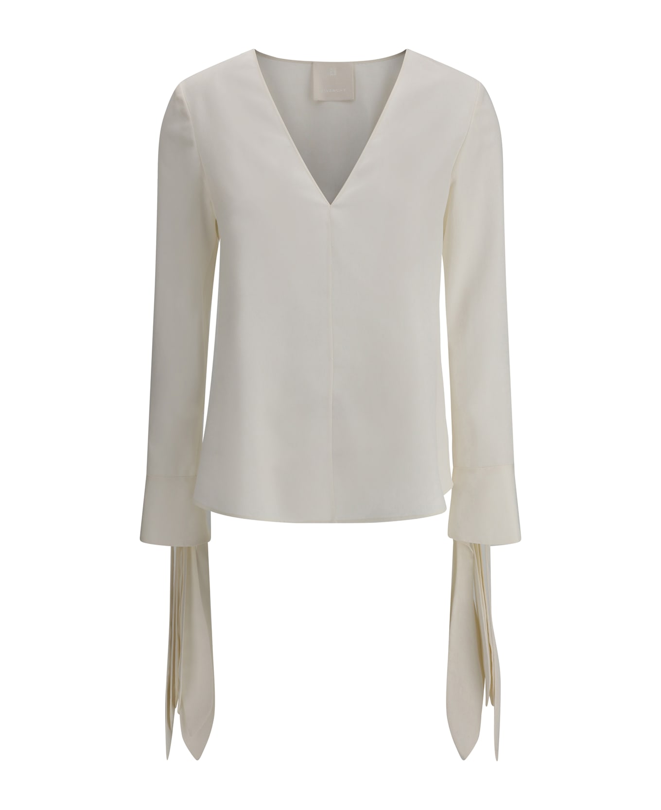 The givenchy silk blouse is an elegant and sophisticated piece, perfect for those seeking a refined look but with a touch of originality. the v-neckline on the front adds an accent of discreet sensuality, while the knotted bows on the cuffs give a romantic and distinctive detail. the iconic logo of the brand on the front adds a touch of recognisability, without being too invasive. made of high-quality silk, this blouse is perfect for elegant occasions or to add a touch of luxury to a more casual look. a piece that combines sophistication and modernity impeccably.