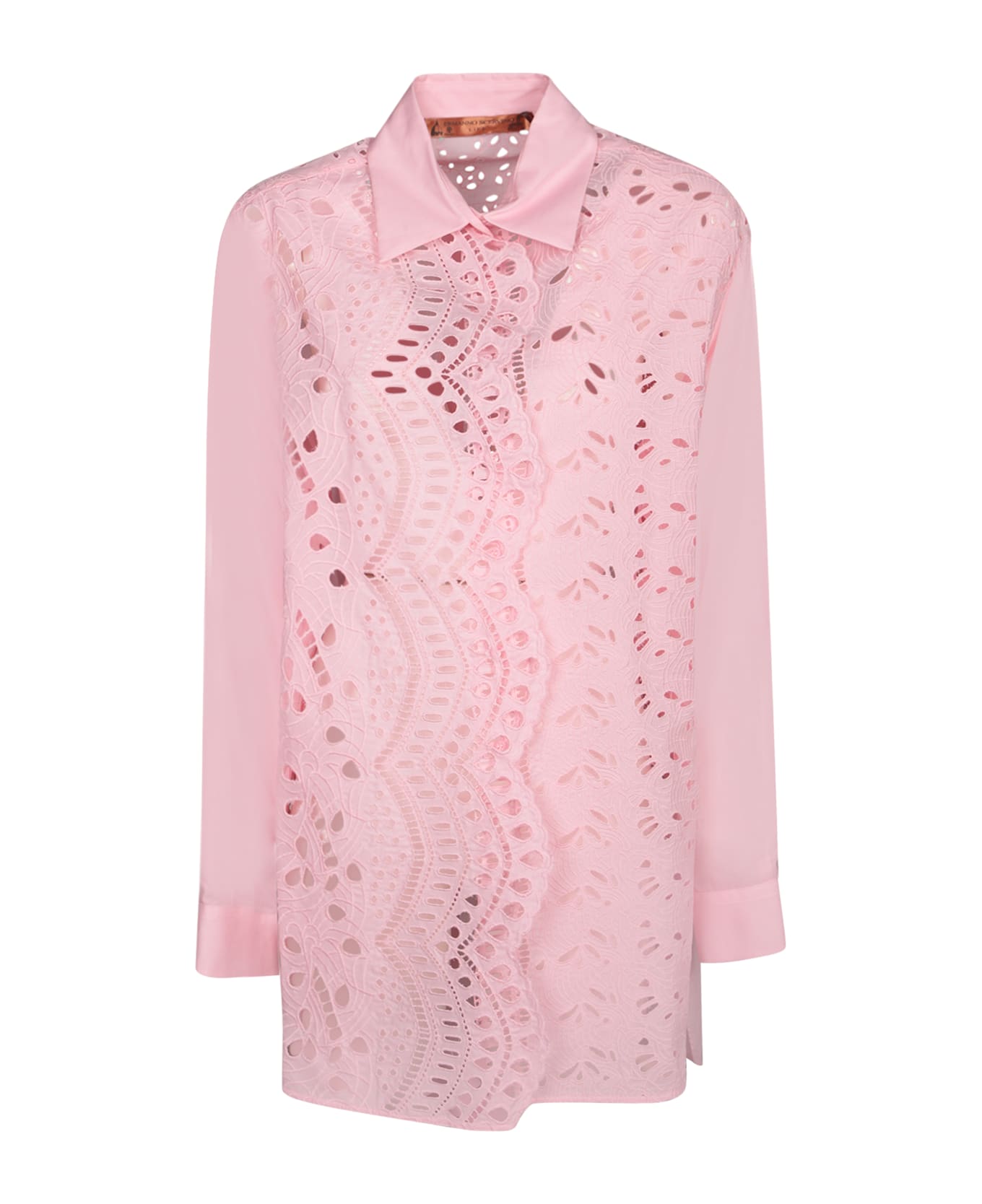 This pink oversized shirt by ERMANNO SCERVINO is crafted in delicate sangallo fabric, featuring an embroidered design with cut-out details that add a touch of sophisticated femininity.