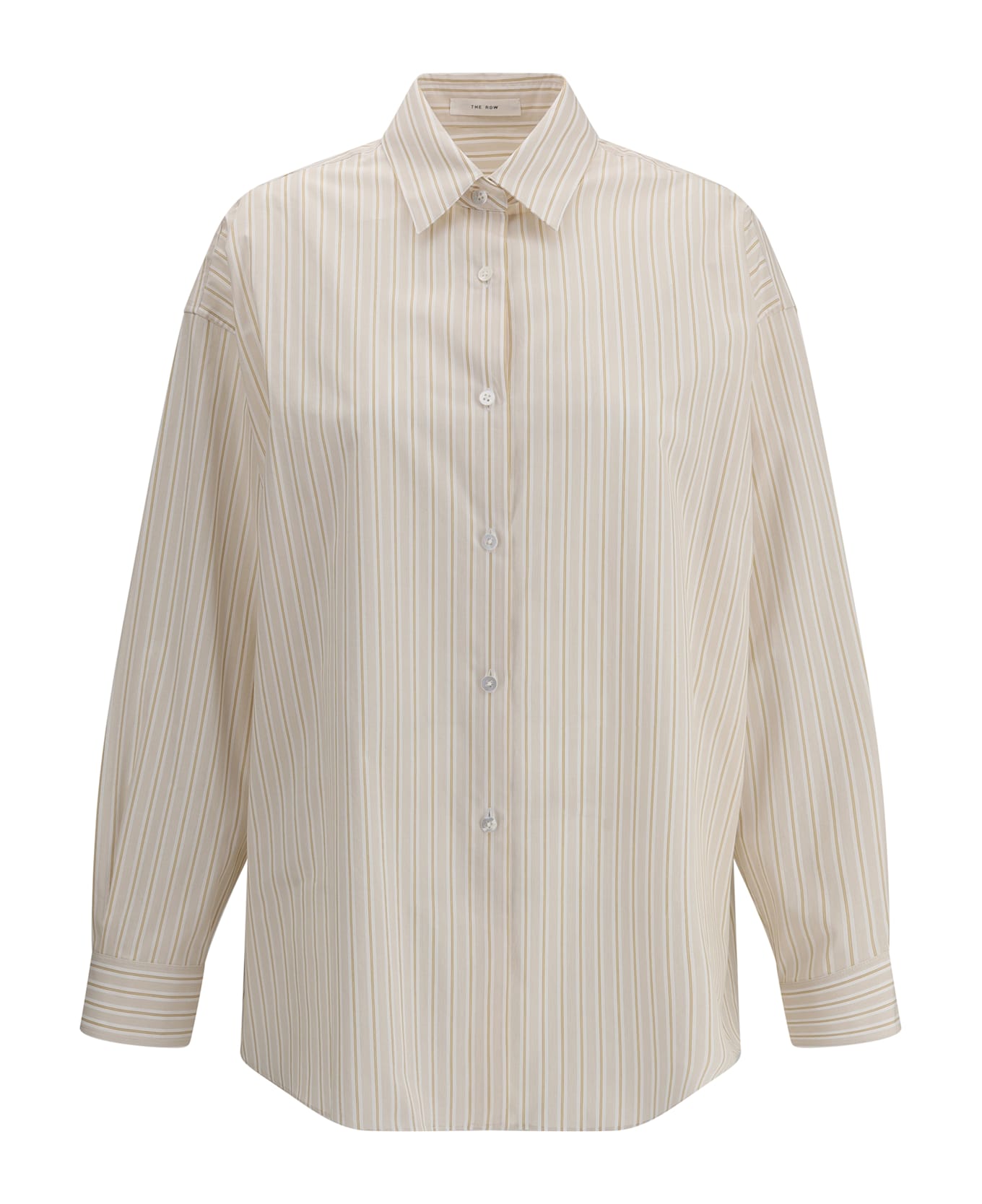 The row's striped caster shirt is a minimalist and refined garment. with a classic collar and front button closure, it features a clean silhouette and understated design. the subtle stripes add a touch of understated elegance, making this shirt perfect for a stylish and versatile look.