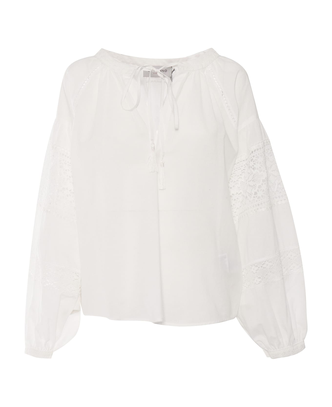 Ermanno Firenze white shirt in cotton with lace inserts, long balloon sleeves, neckline with coulisse closure and napppines.