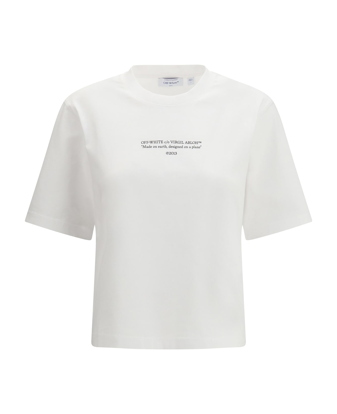 The loose-fit t-shirt by off-white embodies understated luxury through virgil abloh s unmistakable vision. crafted from premium heavyweight cotton, it delivers exceptional comfort with a refined, substantial feel. the oversized silhouette, featuring a classic crew neck and short sleeves, reflects a clean, effortless aesthetic designed for elevated everyday wear. the design is intentionally minimal, highlighted only by a subtle black text print on the chest reading off-white c/o virgil abloh made on earth, designed on a plane ©2013, affirming its place within the brand s iconic universe. the back is left unembellished, reinforcing a sleek, modern attitude and a bold sense of individuality.