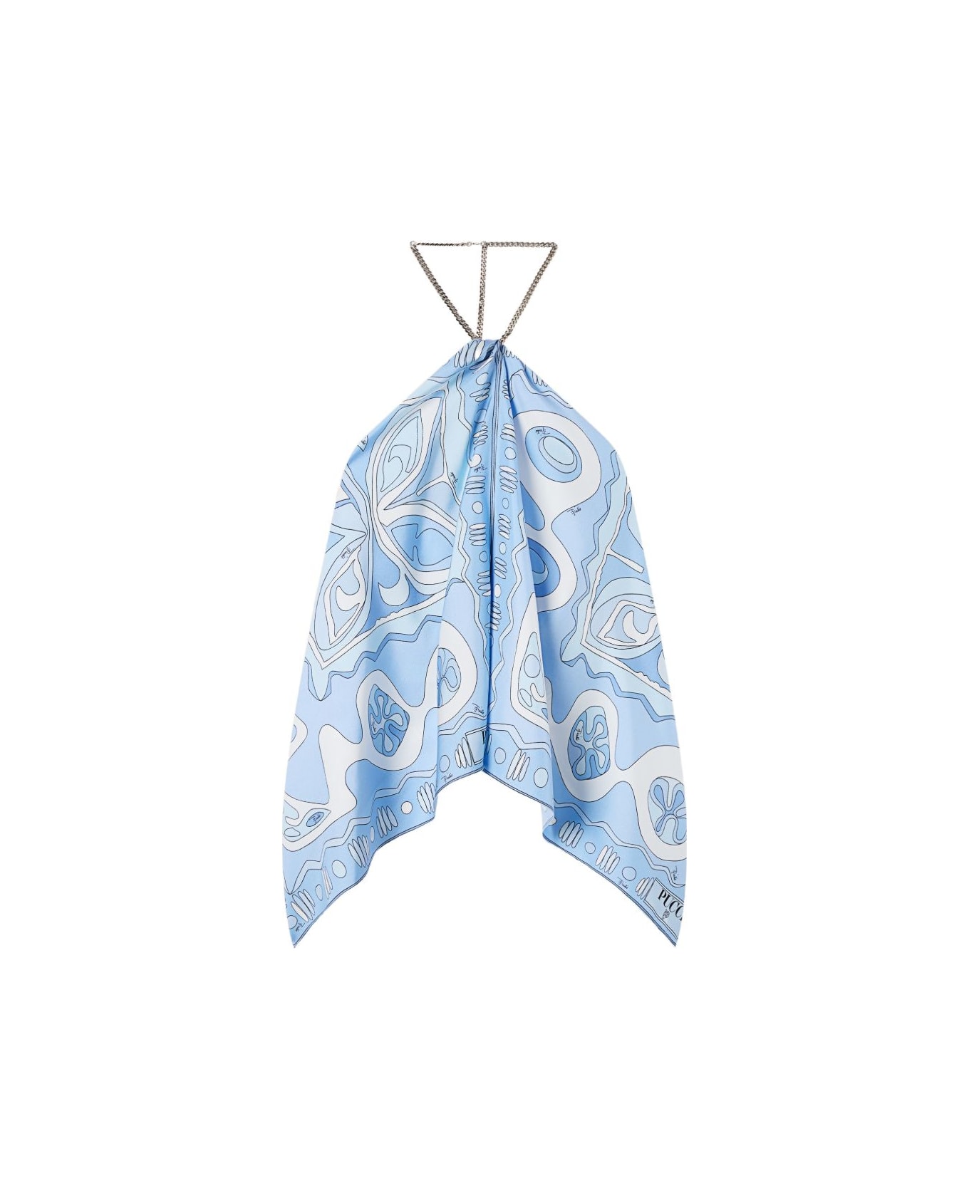 A light and sophisticated top that combines fluidity and jewel-like details. Made from silk twill, it glides over the body with natural elegance, while the chain detail at the neck adds a bright, bold accent, balanced by the mix of prints in pale blue, which enliven the surface with a delicate, harmonious rhythm. A garment designed to enhance movement with refinement and personality. pale blue 100% silk halter neckline chain at the neck made in Italy To offer you a unique Pucci garment, we use an all-over print that makes the product unrepeatable. Therefore, the pattern print may vary from the one displayed in the photo.