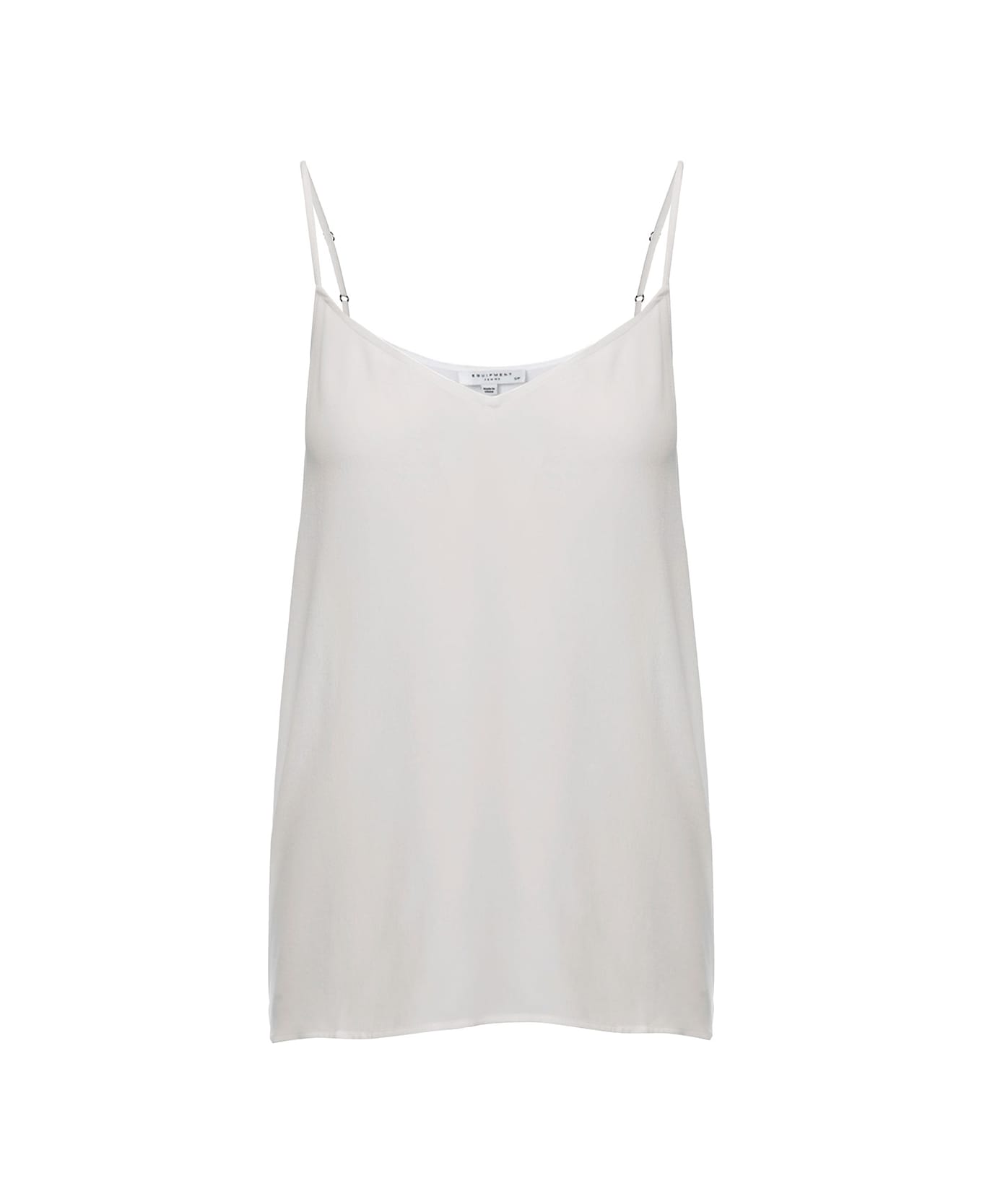 Camisole top Adjustable spaghetti straps Sleeveless V neckline Tonal stitching Straight hem White Silk Relaxed fit