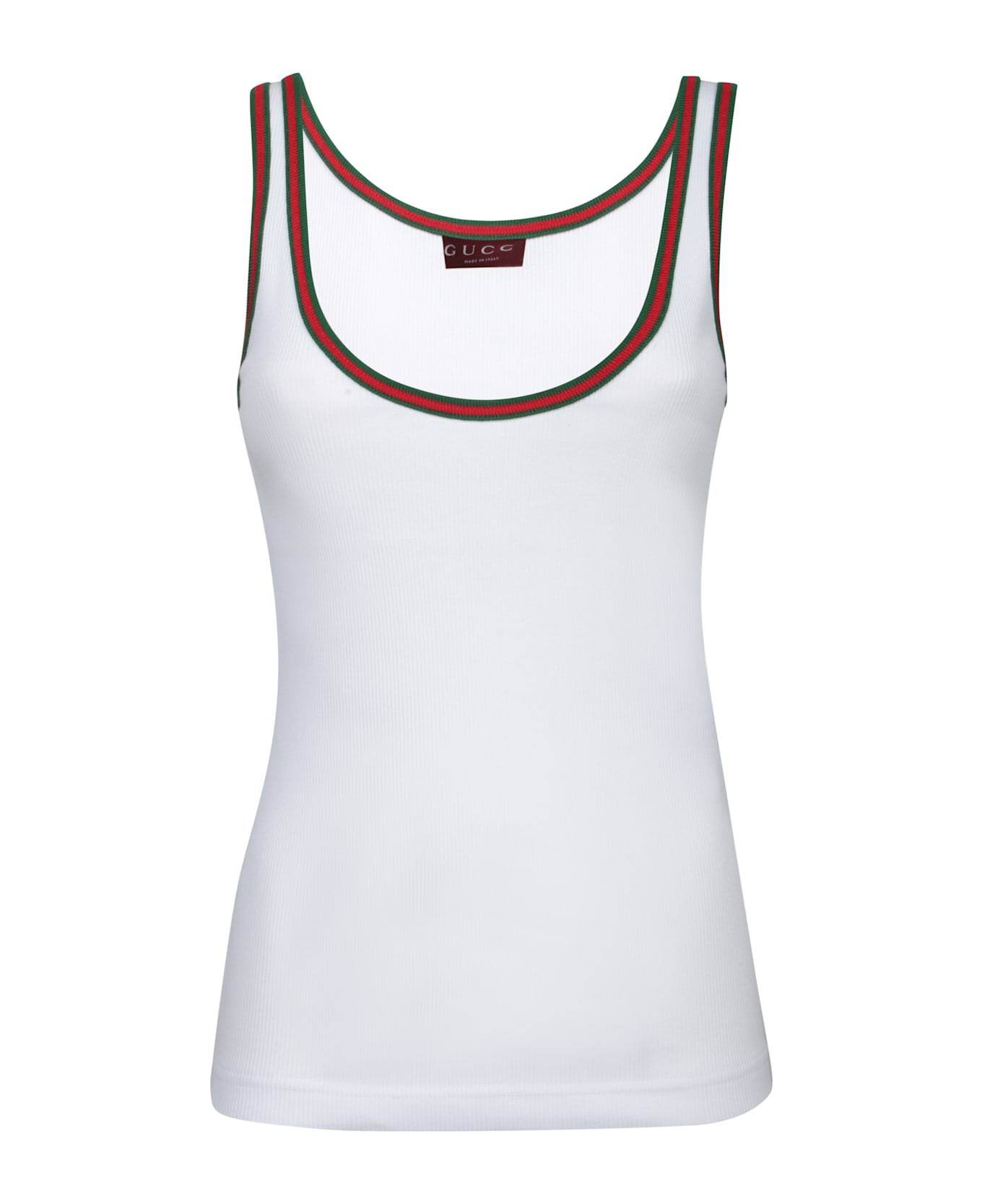 Elegant Gucci white tank top embellished with exclusive green and red trim edges for a touch of sophistication. Composition: 98% Cotton, 2% Elastane