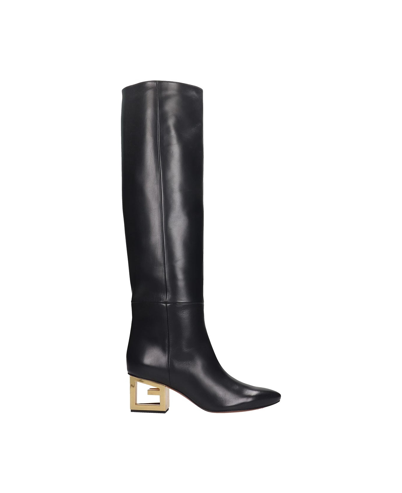 Triangle high High heels boots in black leather, pointed toe, slip on, gold heel detail, 60 mm heel
