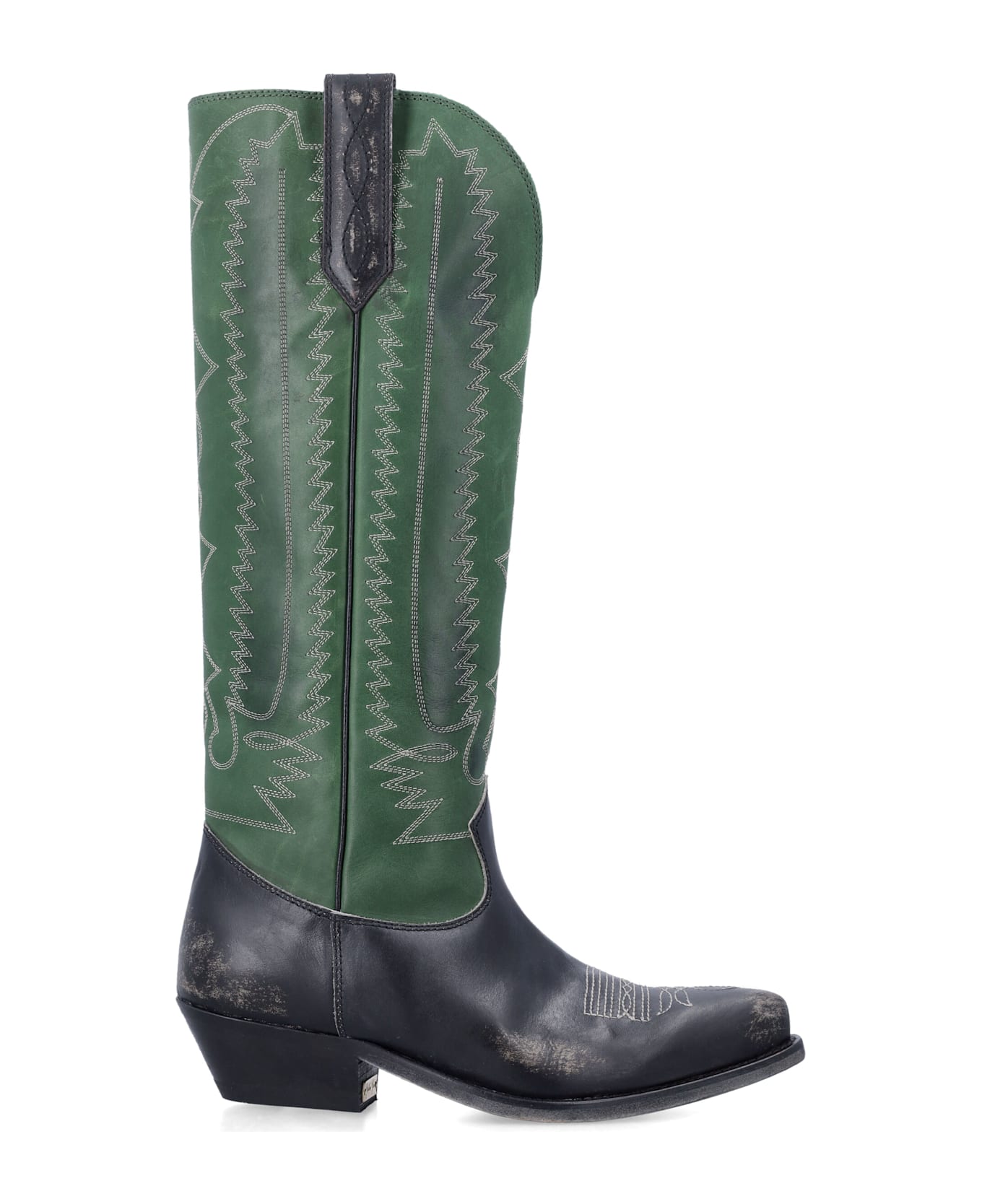 The Golden Goose Wish Star Boots Merge Venetian Artisan Tradition With Cowboy Spirit. Crafted In Black Leather With A Green Leather Leg, They Feature Contrasting White Embroidery On The Leg And Toe, Black Piping, And A Gold-colored Metal Plaque Engraved With The Golden Goose Signature On The Heel. Vintage-finished And High With A Low Heel, These Boots Make A Bold, Stylish Statement. Black Leather Upper With Green Leather Leg Contrasting White Embroidery On Leg And Toe Black Piping High Boot With Low Heel Vintage Finish Heel: 4 Cm