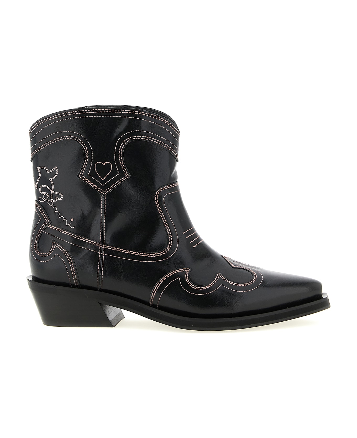 'Low Shaft Embroidered Western' ankle boots in leather-effect fabric with contrast embroidery, Texan model, tapered toe, low angled heel, rubber sole. SUSTAINABLE: the article contains Oleatex , a new generation material that is part of Ganni's Fabrics of the Future initiative. Oleatex is an innovative alternative to synthetic materials, made using byproducts from olive oil production to form a bio-based polyurethane (PU) top coating bonded to a cotton, viscose or recycled polyester backing.