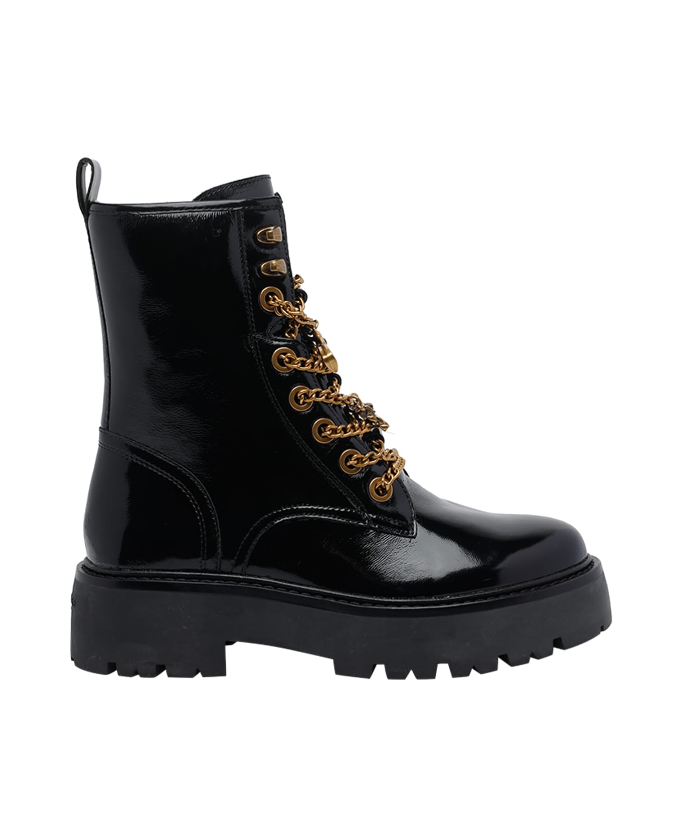 Kurt Geiger black Matilda charm booties, round toe, laces and lateral zip closure, patent leather