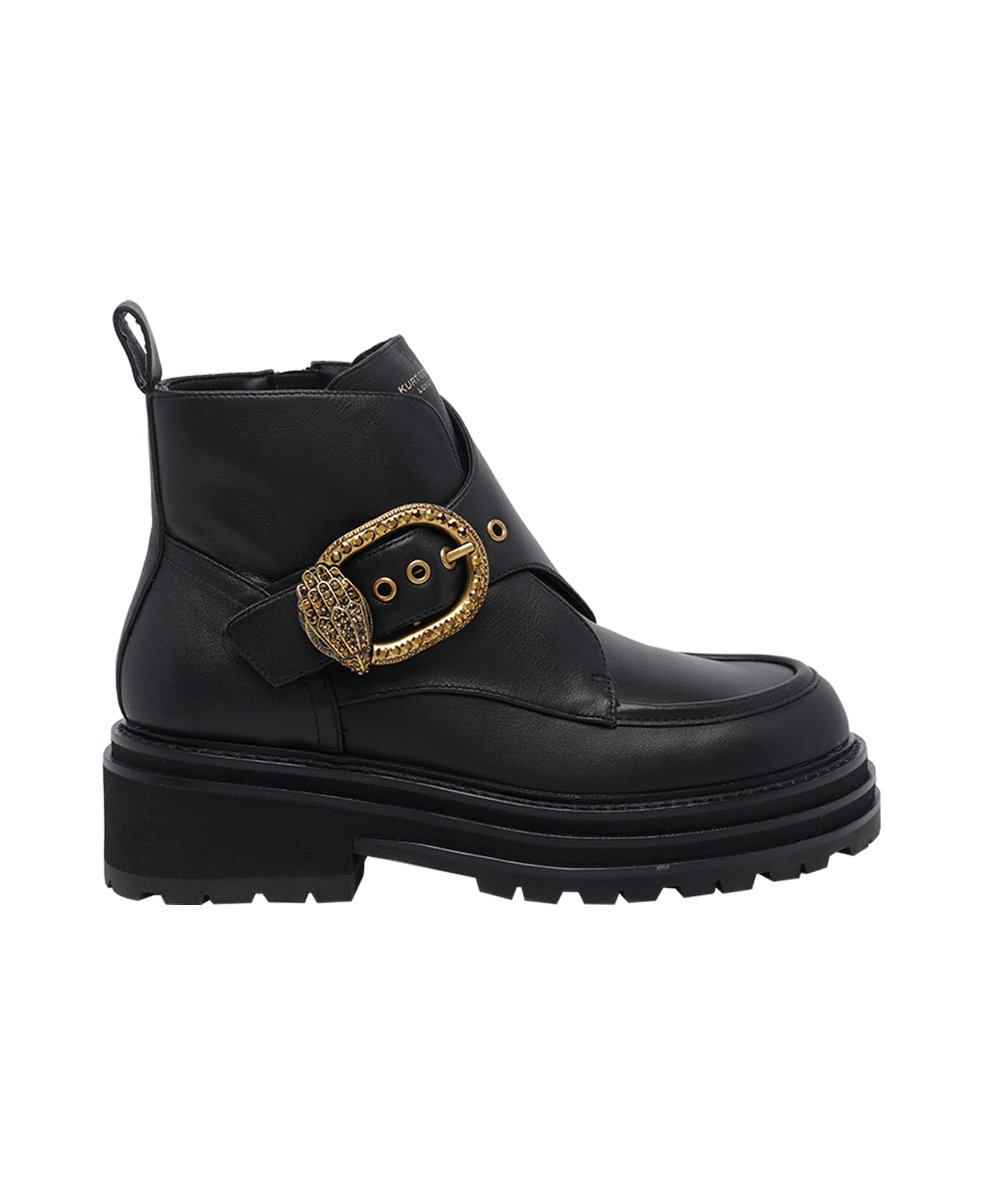Kurt Geiger black Mayfair chunky booties, round toe, lateral buckle closure, leather upper, lateral zip closure