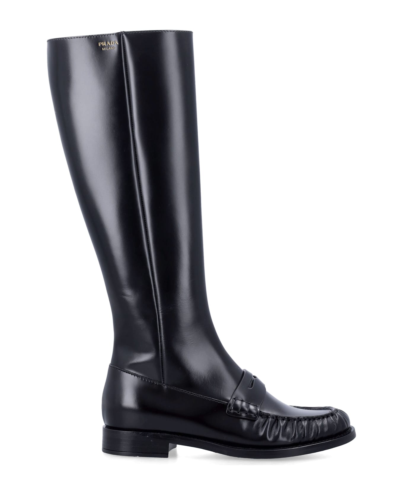 The Penny Knee-high Boots By Prada Transform The Classic Loafer Aesthetic Into An Elevated Tall Silhouette. Crafted From Polished Black Leather, They Feature A Gathered Apron And Traditional Penny Strap. The Sleek Lines And Leather Sole Complete A Refined, Modern Interpretation Of An Iconic Style. Polished Black Leather Upper