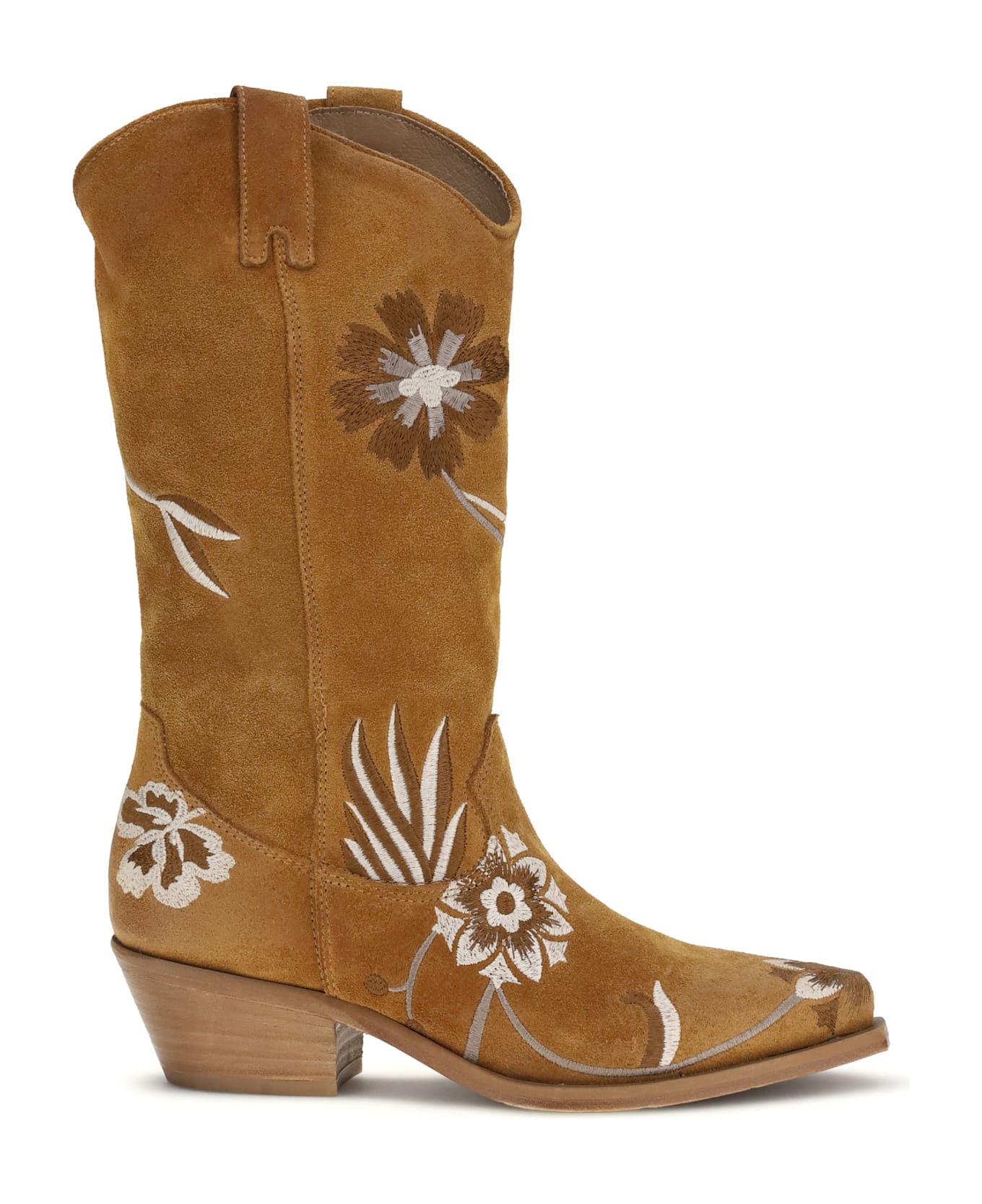 The texan boots by p. a. r. o. s. h. are made of suede and feature a texas heel and tapered toe. all-over floral embroidery adds a decorative and distinctive touch, combining western style and fine details.