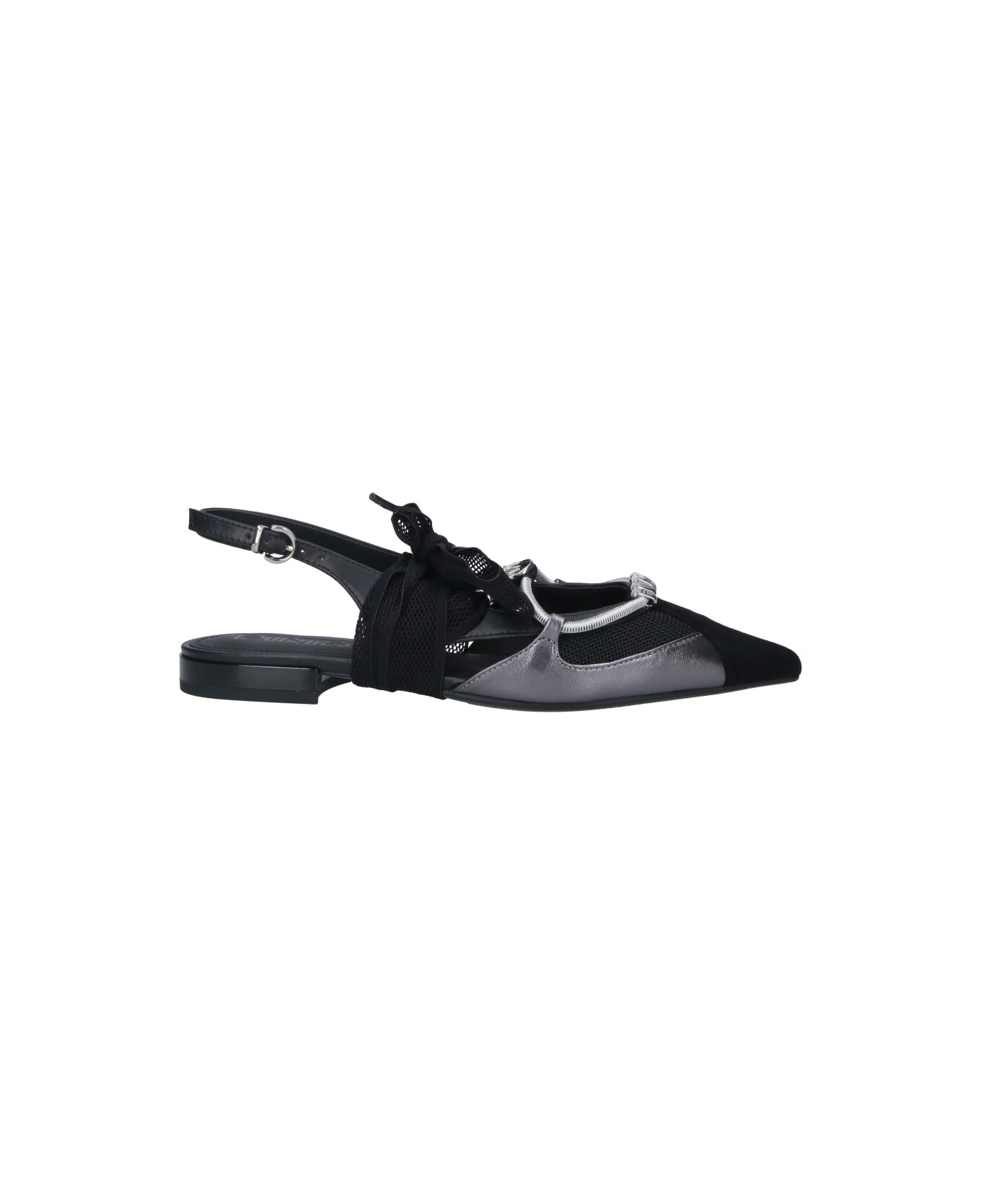 - Ballet flats "Gianira" Pinko in black leather and fabric - pointed design - silver metal logo charms on the front - contrasting bow detail - rubber sole