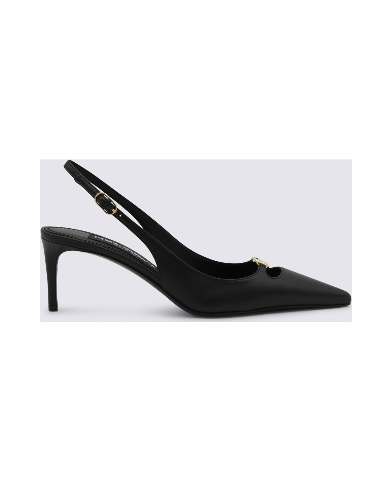 Black leather pumps from Dolce & Gabbana featuring pointed toe, slip-on style, open back, frontal logo and gold tone hardware. Composition: _cover, 100% Le Sole, 100% Le