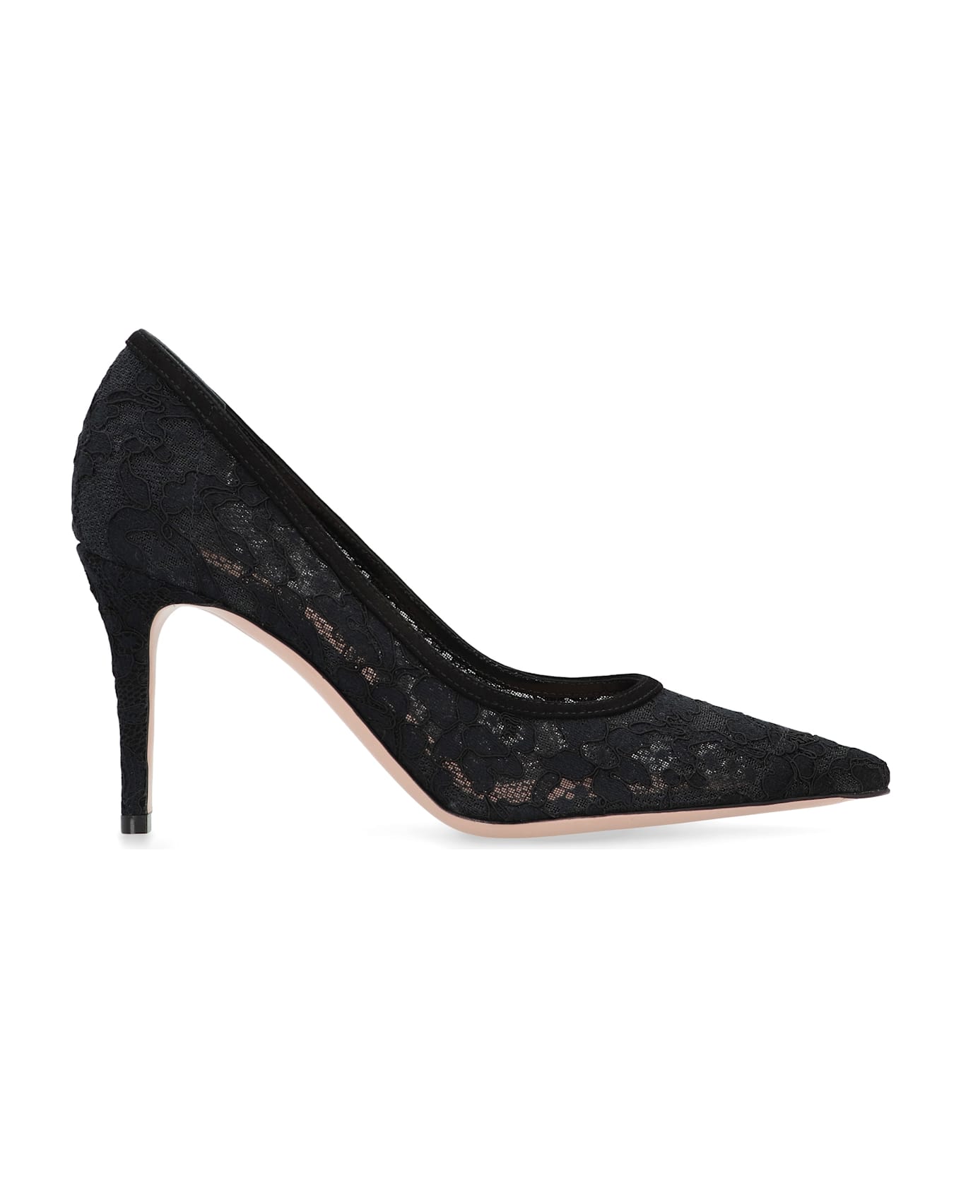 Pointe decollete model, made of black lace with suede details. the high heel is 8. 5 cm.