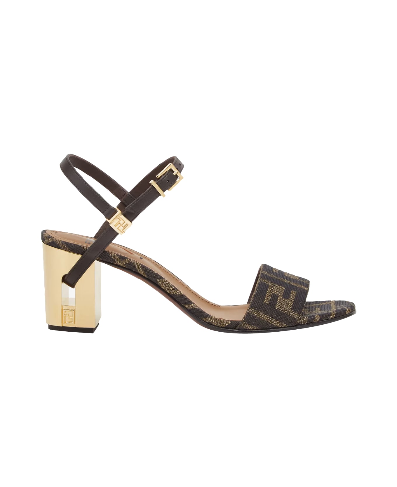 Fendi brown Delfina pump sandals, round toe, FF logo allover, lateral buckle closure Composition: 100% Fabric, 100% Calf Leather/leather Sole