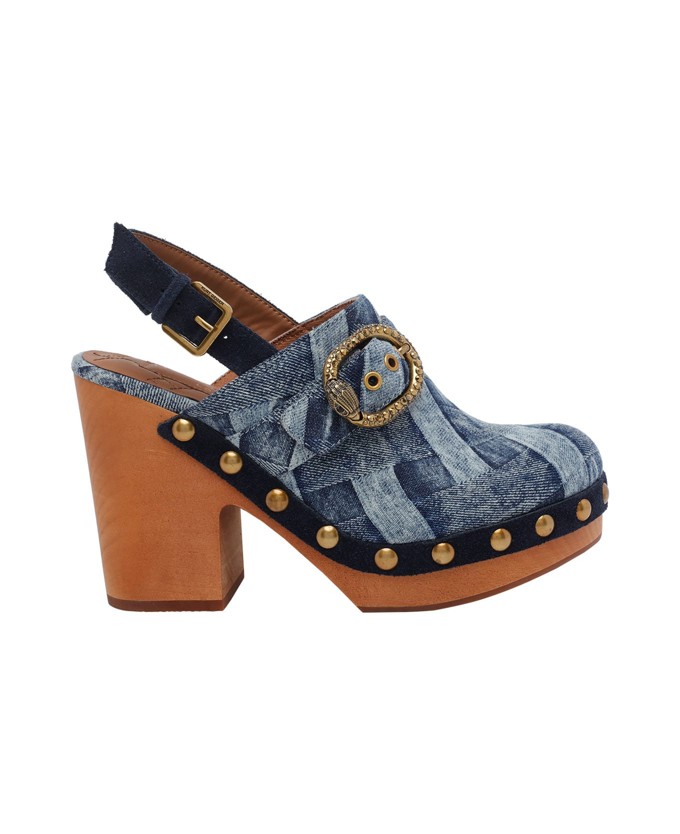 Kurt Geiger blue Mayfair pump clog, round toe, lateral buckle closure, denim effect