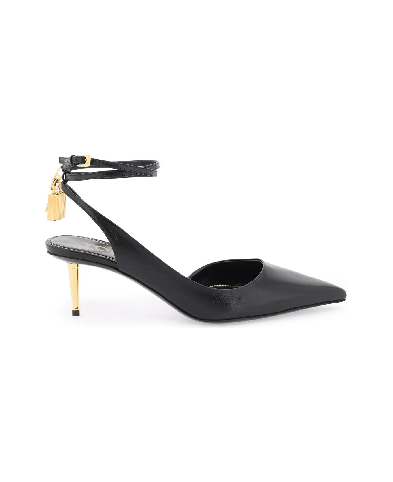 Tom Ford pumps crafted in leather and featuring a gold metal heel and iconic padlock on the adjustable ankle strap. Leather insole and leather sole.