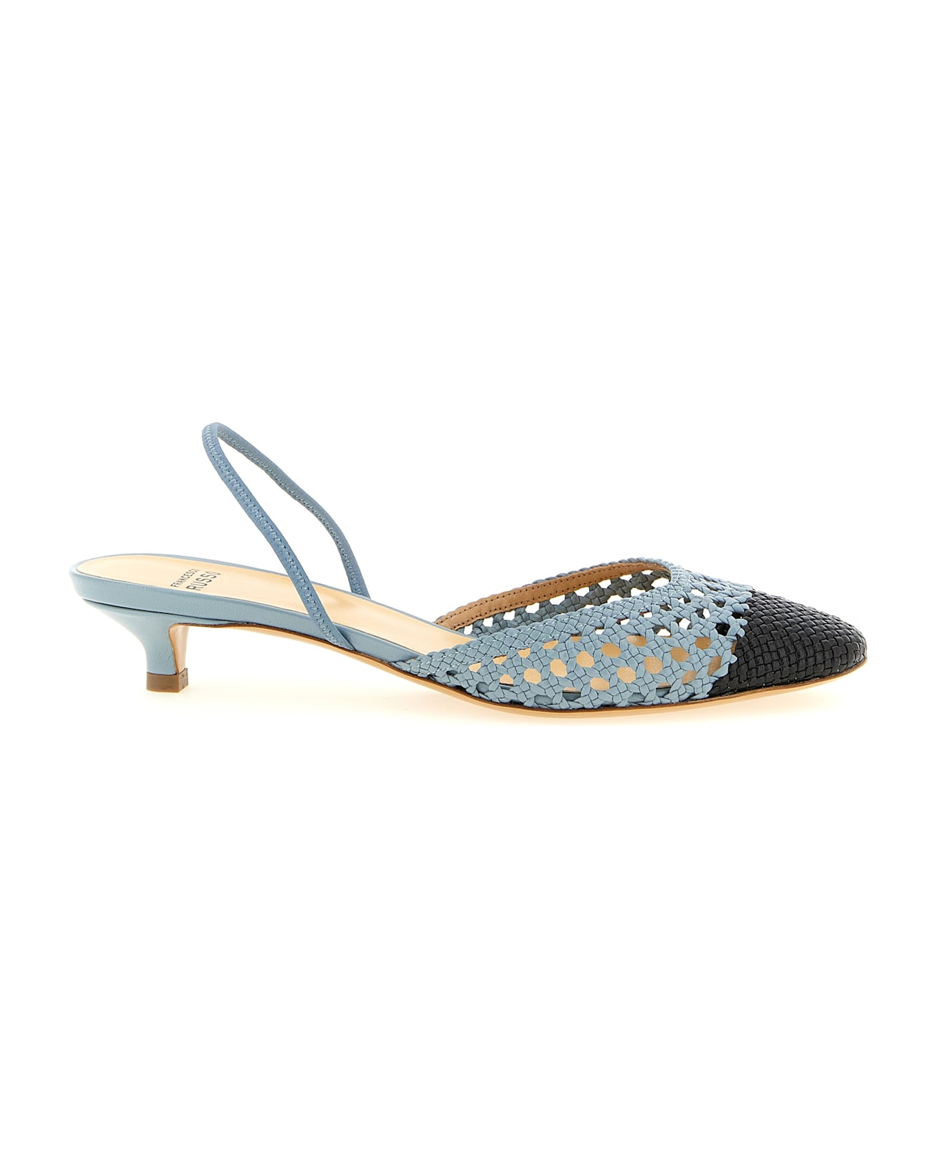 'R1P1021' slingbacks in two-tone crocheted nappa leather, almond toe, back elastic strap, heel, leather sole.