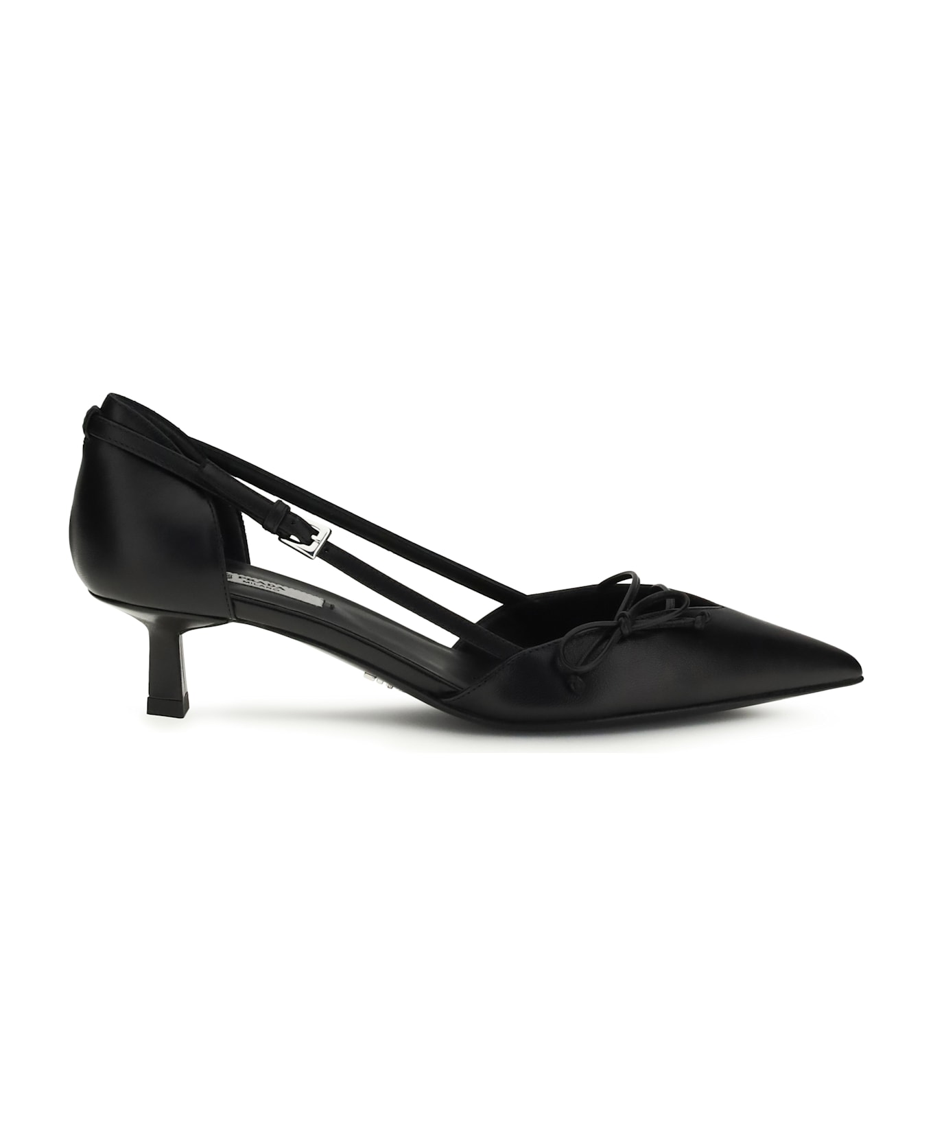 The side-cut leather pumps by prada combine feminine elegance with sophisticated style. featuring an elongated toe, kitten heel, and bow detail on the upper, they have a metal buckle closure, leather sole, and metal logo lettering, perfect for completing refined and distinctive looks. Composition: 100% % Goatskin/hircus Goatskin