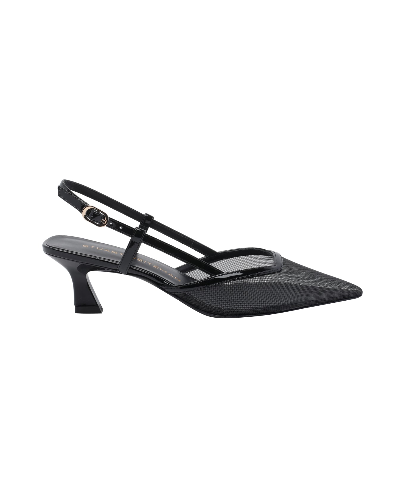 Stuart Weitzman black Vinnie pump slingback, pointed toe, lateral buckle closure, logo