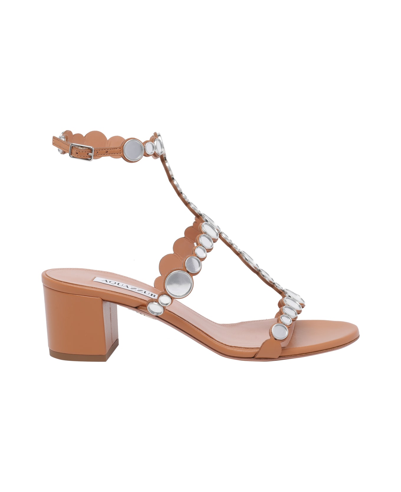 Aquazzura brown Afterglow pump sandals, round toe, leather model, studs allover, lateral buckle closure