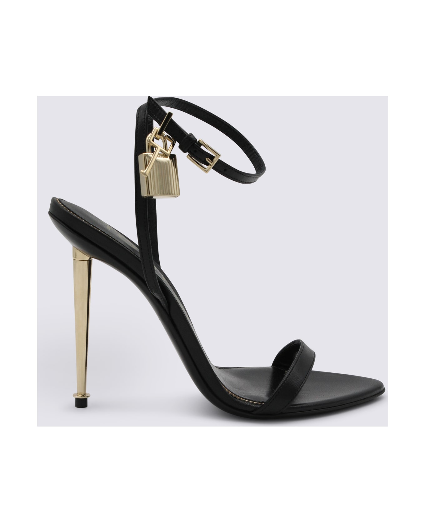 Black leather sandals from Tom Ford featuring open pointed toe, andjustable ankle strap, gold tone stiletto heel and gold tone charms. Composition: _cover Tex/le - Sole, 100% Le