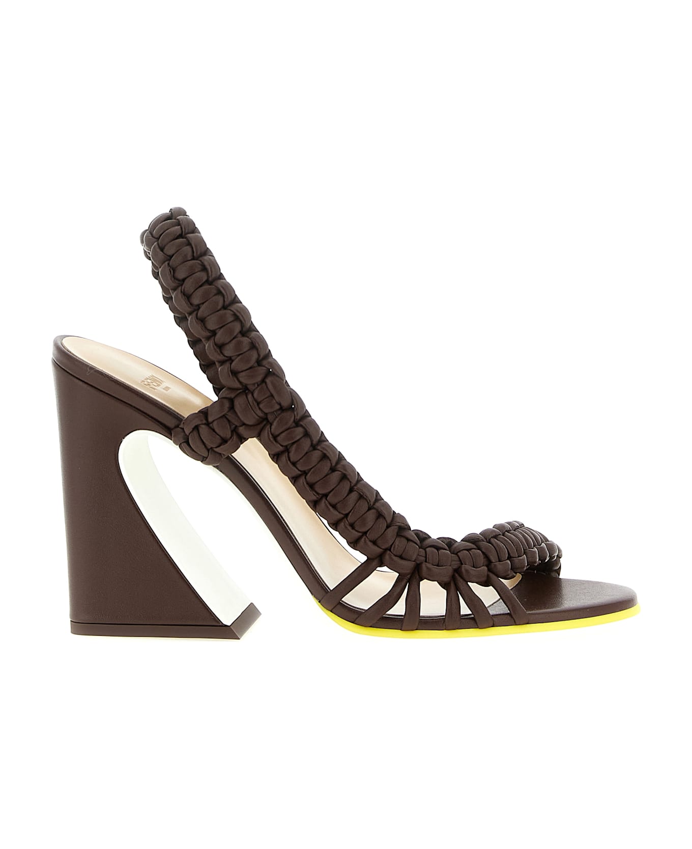 'Fendi Arco' leather sandals with handcrafted weave inspired by parachute knots, asymmetric design, wide heel featuring the iconic shaped Arco pattern with painted metal detail, two-tone rubber sole with FF design.