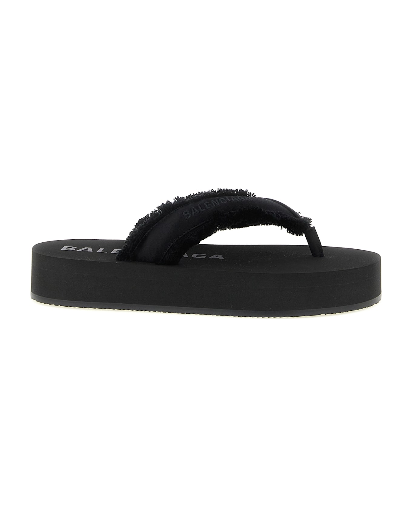 'Jet Lag' brushed satin sandals with flip-flops style, rounded toe, padded upper with fringes and tone-on-tone lettering logo embroidery, platform, TPU sole. Composition: 72% viscose, 28% silk