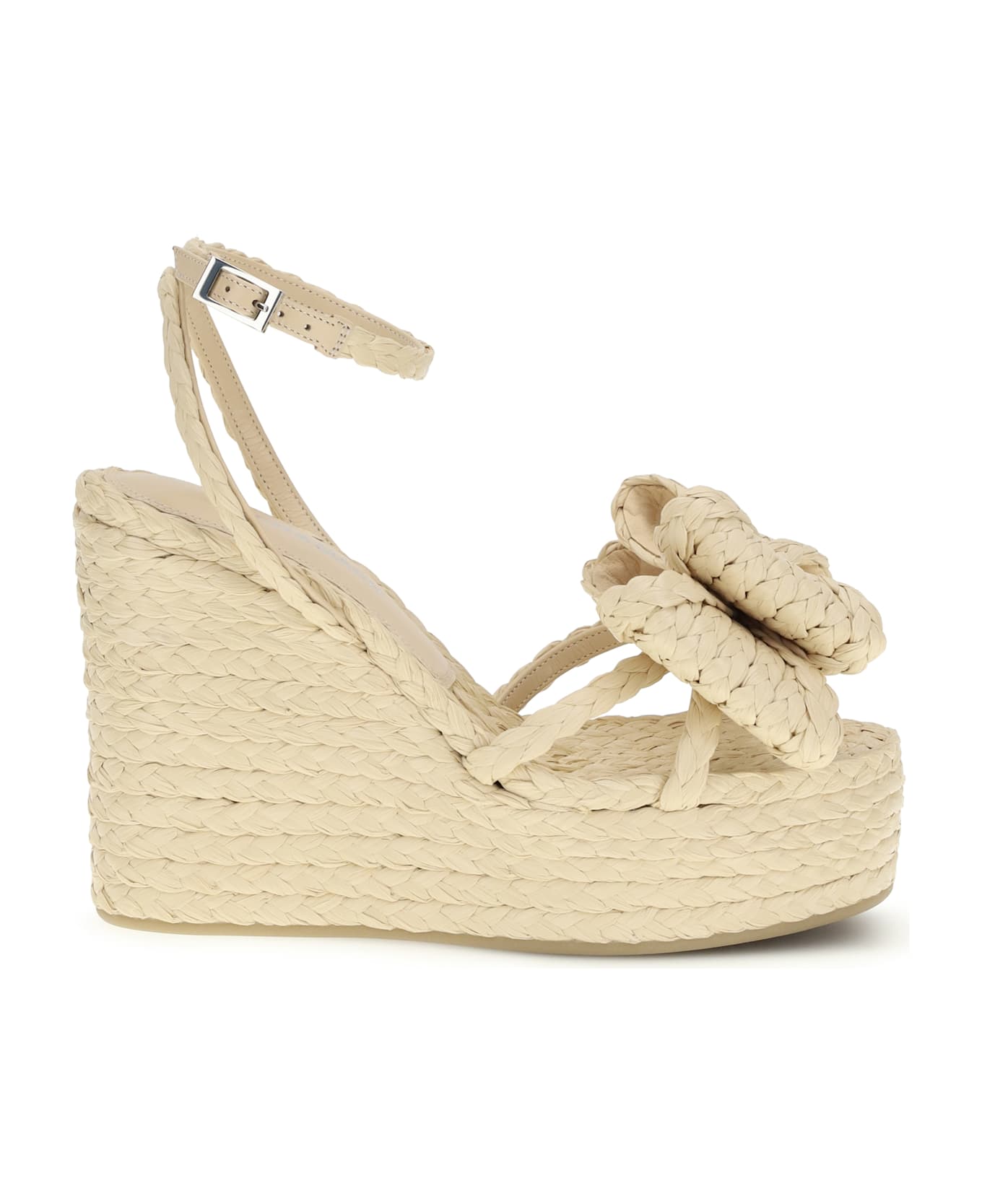 The le cadeau raffia wedge sandals by mach&mach combine elegance and summer freshness. the raffia design, completed by a bow on the front, adds a feminine and sophisticated touch, while the adjustable strap closure ensures a comfortable and stable fit. perfect for enhancing summer looks with style and refinement.