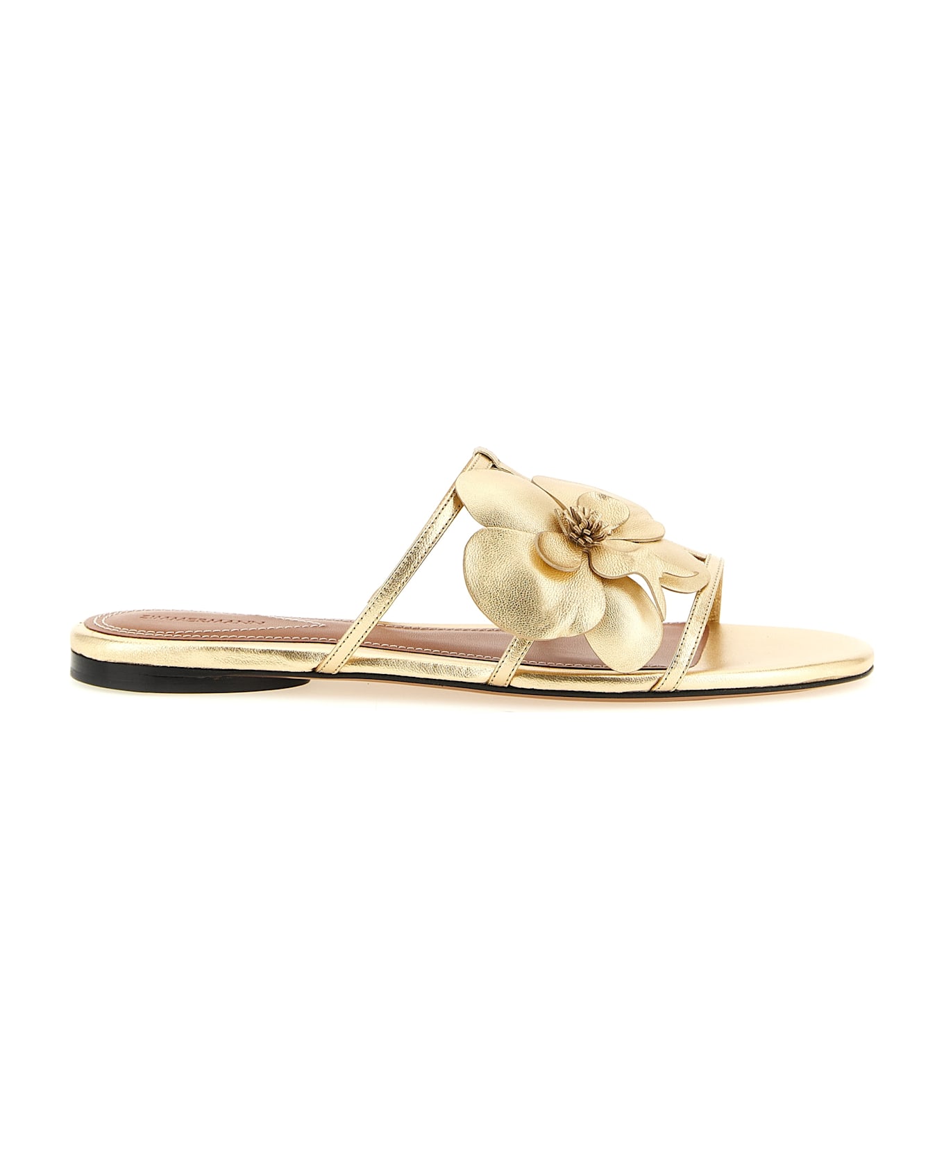 Laminated leather slides, tone-on-tone laminated leather 'Orchid' details on the front with asymmetric design, and leather sole.