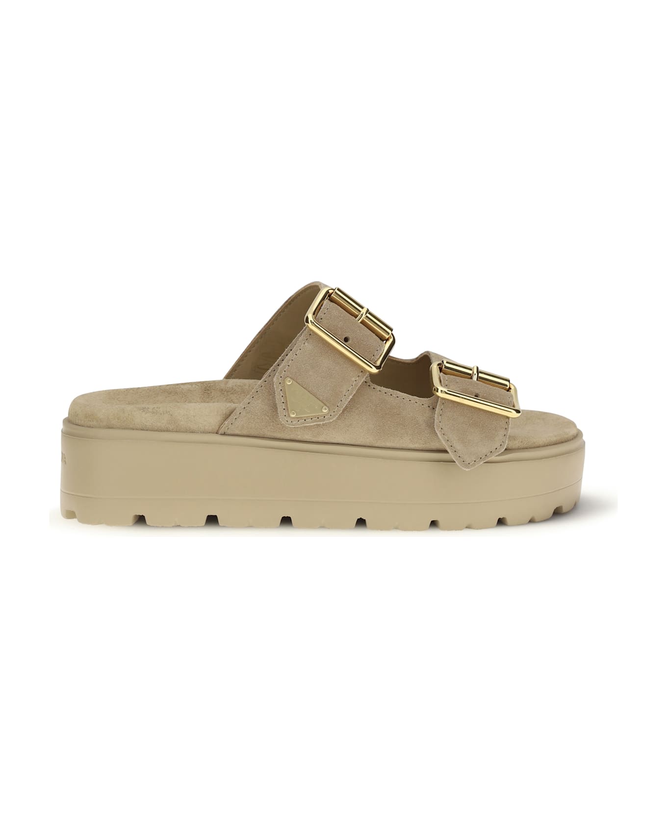 The platform sandals by prada are a perfect blend of modernity and boldness. crafted from soft suede, these sandals stand out for their two buckles on the front, which add a touch of bold and practical style. the chunky platform sole gives them a gritty, contemporary look while ensuring comfort and height. another distinctive signature is the iconic triangular plaque on one of the buckles, expressing prada's unmistakable dna.