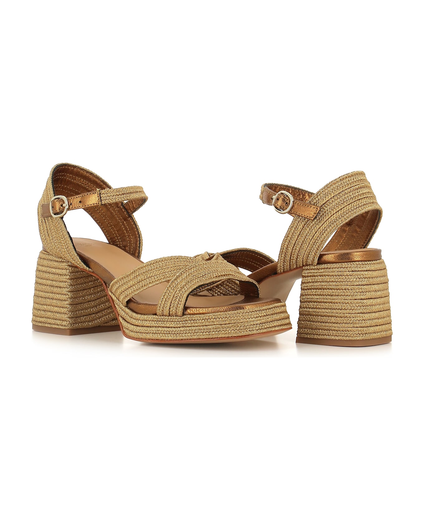 Gold raffia and leather women's sandal by Castaner, feauturing by an ankle strap closure. Cuerolite sole. Lined interior. Plaeaux: 2,5 cm Heel: 7 cm