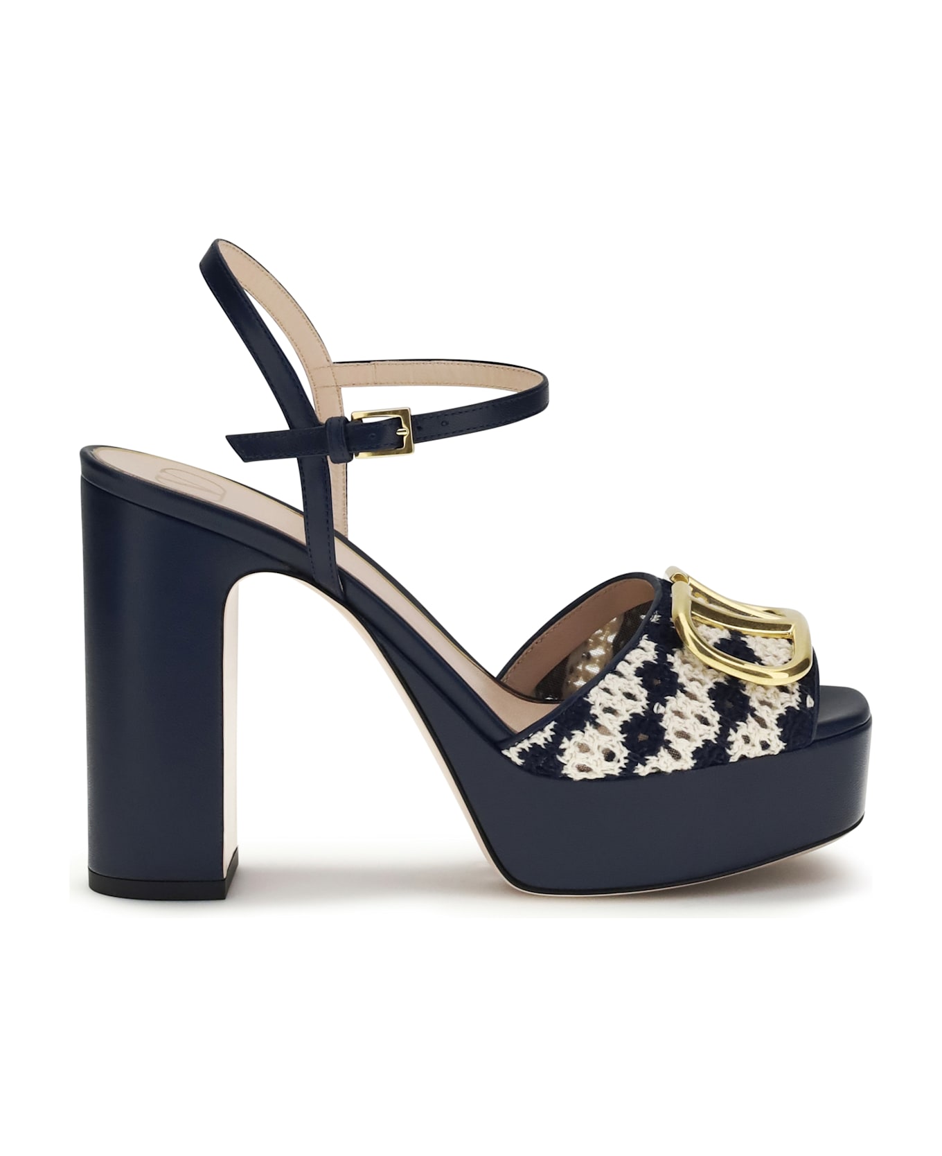 The vlogo signature platform sandals by valentino garavani combine elegance and originality. crafted in crochet fabric with kid leather details, they are enhanced by the antiqued brass vlogo signature. the wide heel and kid leather-wrapped platform ensure comfort and style, perfect for completing sophisticated, on-trend looks. Composition: 80% % Calf Leather Bos Taurus, 20% % Cotton