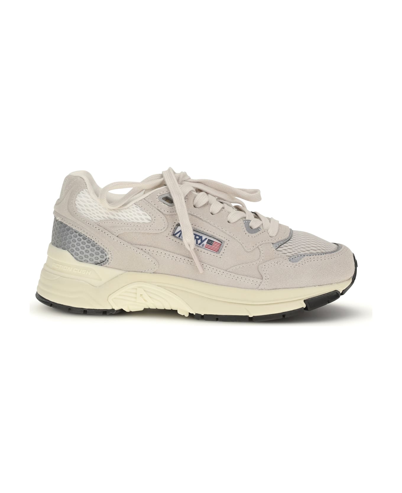 The hyperway low sneakers in suede and fabric by autry combine elegance and comfort in a contemporary design. the elongated toe in perforated fabric gives a dynamic look, while the lace-up closure ensures an adjustable fit. the iconic contrasting monogram on the side adds a distinctive detail and the platform sole guarantees stability and comfort. ideal for a casual outfit with refined taste.