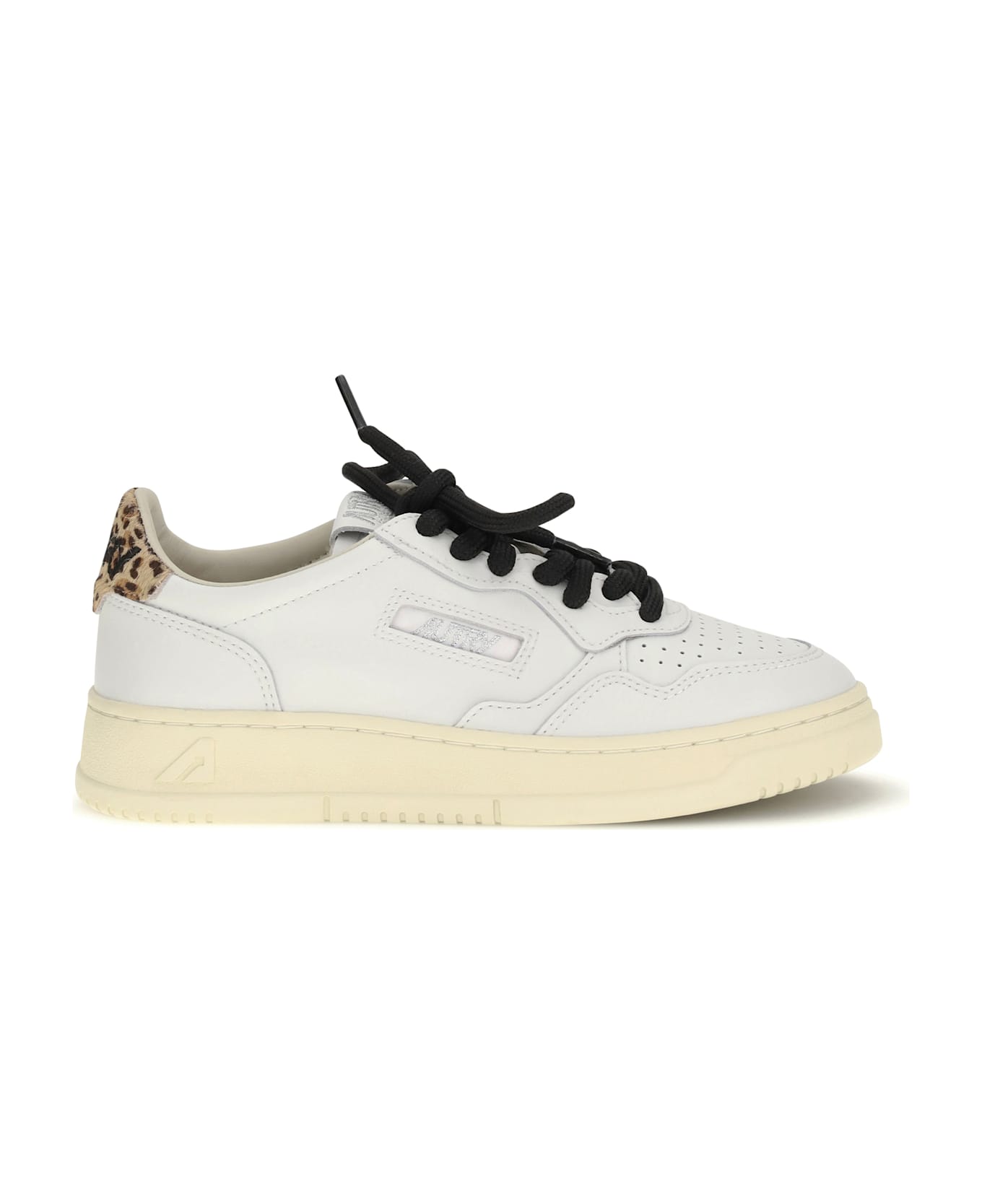 The medalist low leather sneakers by autry combine elegance and boldness in a unique design. the perforated round toe and contrasting lace-up front closure offer an excellent fit, while the leather tongue with tone-on-tone logo label adds a sophisticated touch. the heel tab, embellished with an animal print and embossed logo, gives them a distinctive character, while the contrasting monogram on the side panel emphasizes the brand's identity.
