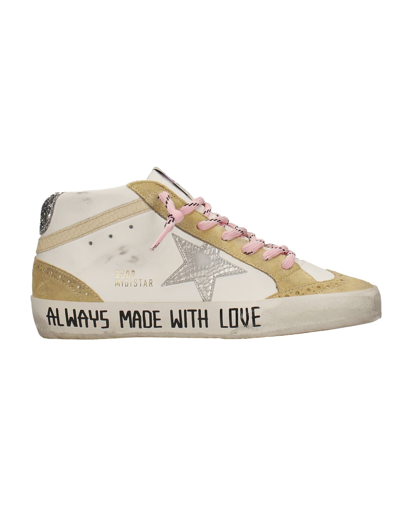 Mid Star Sneakers in white leather, 100% leather, suede details, contrast laces, logo on heel, Made in Italy, leather star on side, rubber outsole, slogan sole