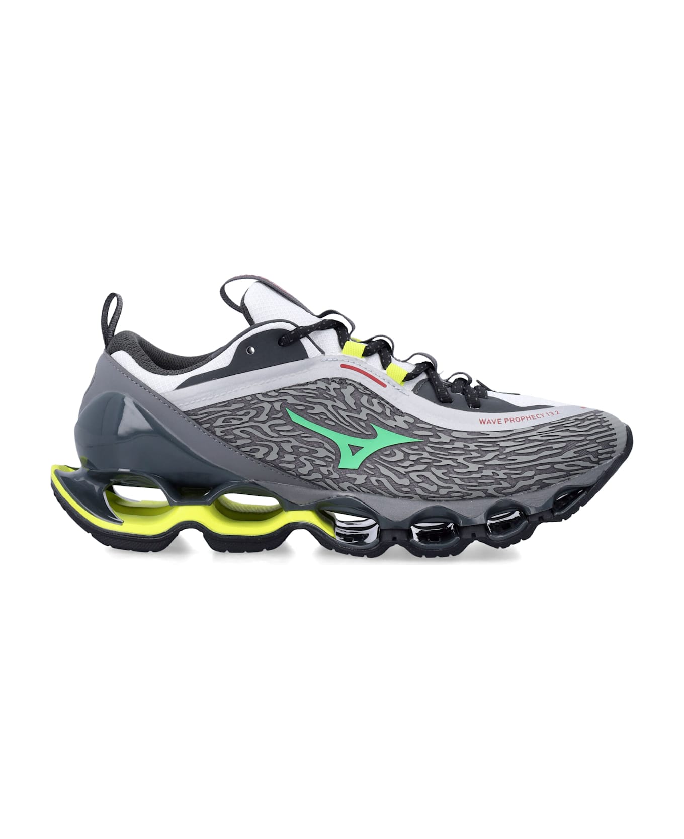 The Mizuno Wave Prophecy 13. 2 In Grey With Neon Accents Blends Cutting-edge Performance With A Bold Aesthetic. Designed For High-impact Runs, Its Wave Midsole Absorbs Shocks While Ensuring Stability. Lightweight, Breathable, And Stylish, These Sneakers Deliver Comfort Without Compromise. Breathable Mesh And Synthetic Upper