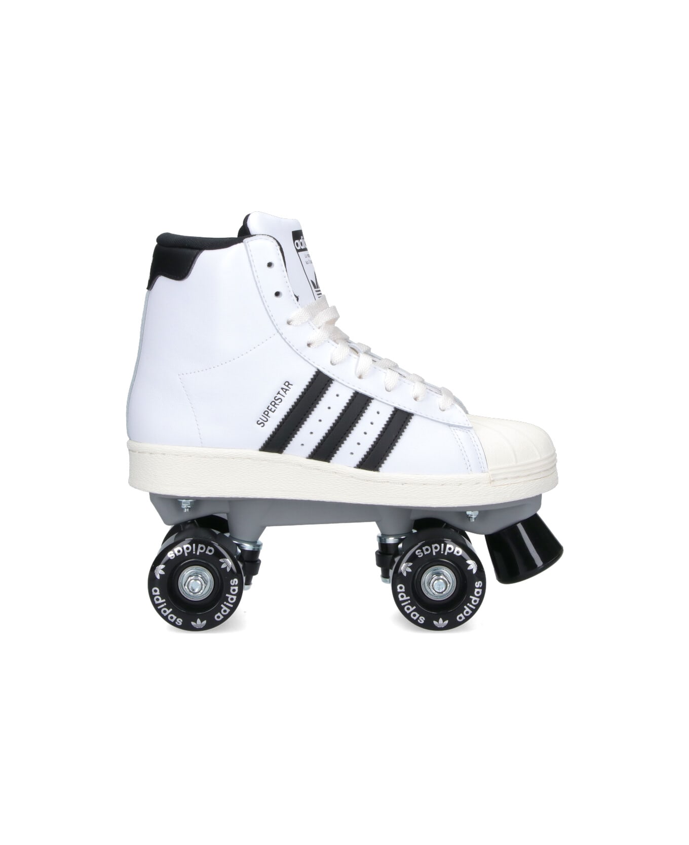 Adidas 'Superstar 82' white leather roller skates with padded design, textured round toe, lace-up closure, contrast logo print on the tongue, iconic contrast leather bands on the side, contrasting logo print on the side, contrasting leather back tab, white 'Trefoil' logo print detail, rubber sole with wheels, front brake detail.
