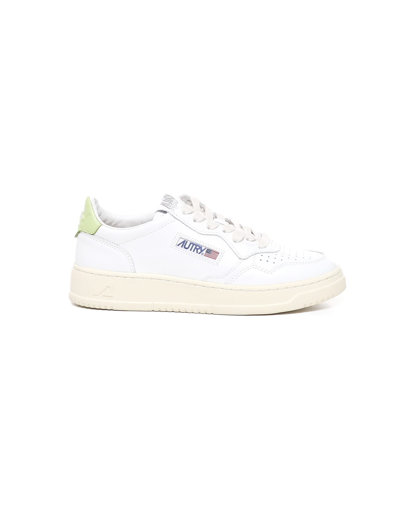 -White leather upper with stitching defining multi-layered tonal inserts -Perforated toe to promote breathability -Cotton flat laces -Leather tongue with foam padding and matching stitched label -Padded collar -Iconic green laminated leather back heel with imprinted logo -Leather and cotton terry lining -Logoed rubber sole -Color: White, Green