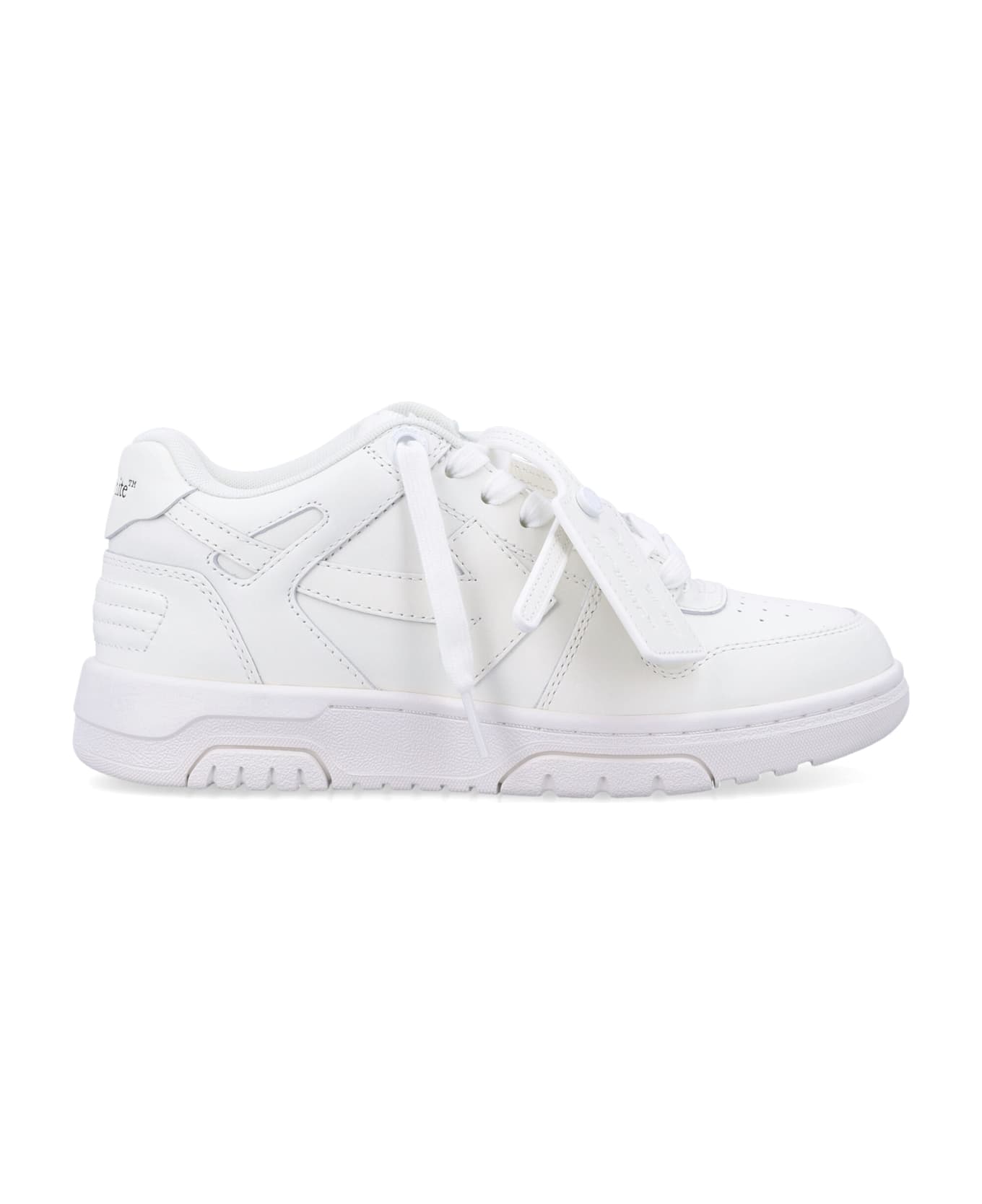 Total White Out Of Office Woman's Sneakers By Off-white. Featuring: Calf Leather Upper Round Toe Perforated Details Lace-up Fastening Logo Patch At Tongue Padded Low-collar Debossed Logo At Heel Counter Rubber Sole