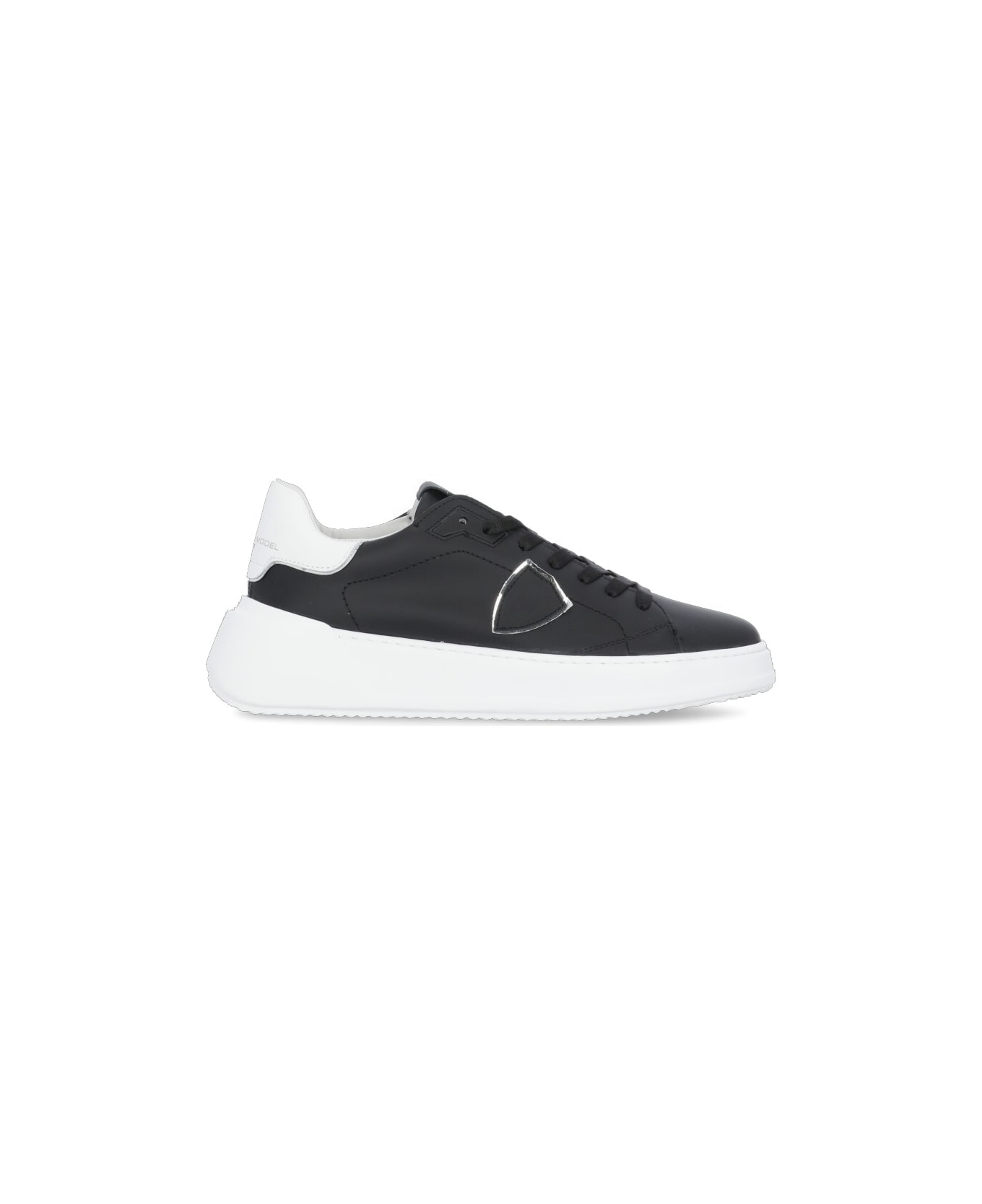 Tres Temple Low Sneakers from Philippe Model: - Black Philippe Model Paris leather sneakers for woman - Round toe - Logoed tongue - Side logoed patch - Contrasting color logoed upper heel - Laces fastening - Contrasting color rubber sole